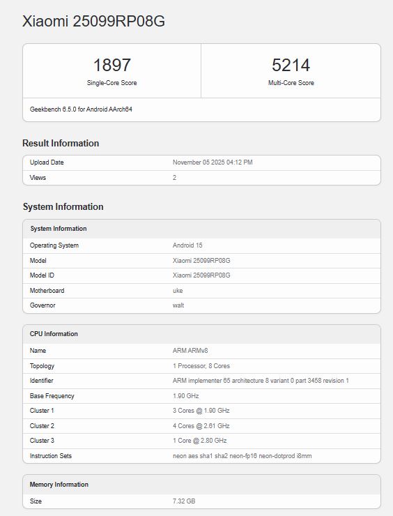 De testade poängen för den här nya enheten - 1 897 i single-core-testet och 5 214 i multi-core - är också båda inom räckhåll för Xiaomi Pad 7 i våra interna tester. Dessutom bekräftar listningen närvaron av 8 GB RAM och Android 15 på enheten.