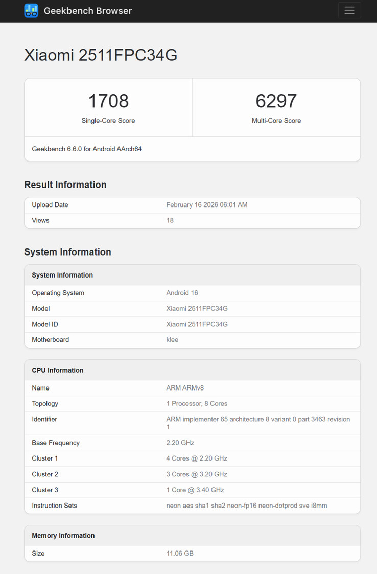 Istället nämner alla Geekbench-listor 2511FPC34G, ett modellnummer vars G-suffix betecknar en global release. Med tidigare läckor i åtanke är den enhet som riktmärks mer sannolikt Poco X8 Pro än den ryktade Poco X8 Pro Max. Geekbench identifierar också att 2511FPC34G har ett chipset i Dimensity 8500-serien, snarare än Dimensity 9500s som Poco X8 Pro Max enligt uppgift är baserad på.