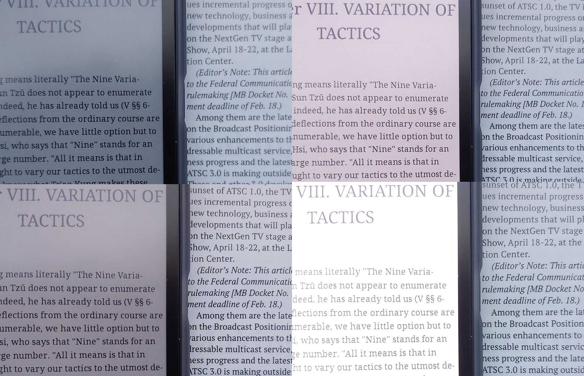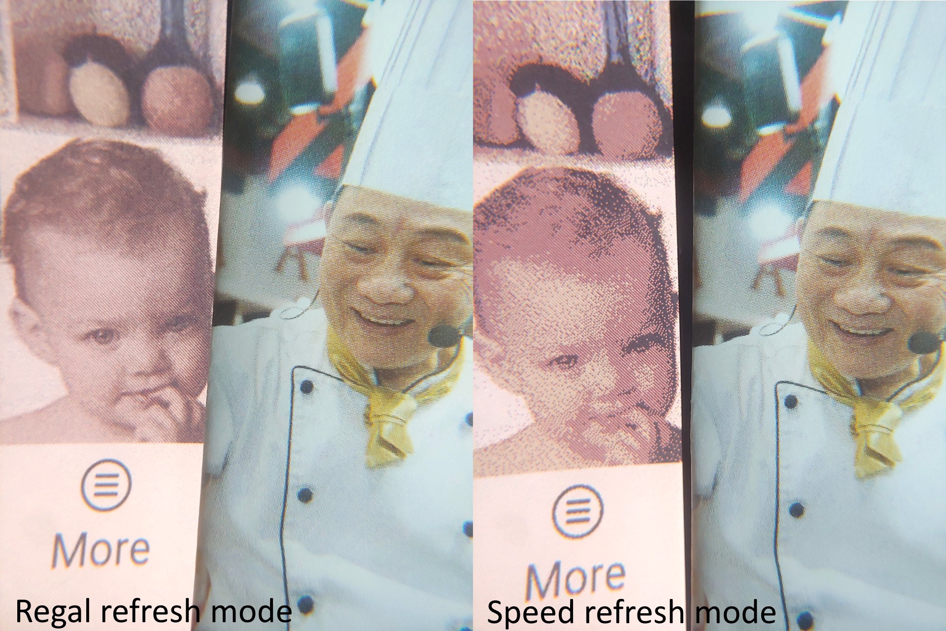 Speed refresh-läget möjliggör snabb skrollning men försämrar den visuella kvaliteten, medan Regal- och HD-lägena förbättrar tydligheten på bekostnad av långsammare interaktioner och enstaka inverterade blixtar. Kvaliteten närmar sig tidningsliknande nivåer i de högre lägena och blir märkbart grövre i Speed-läget.