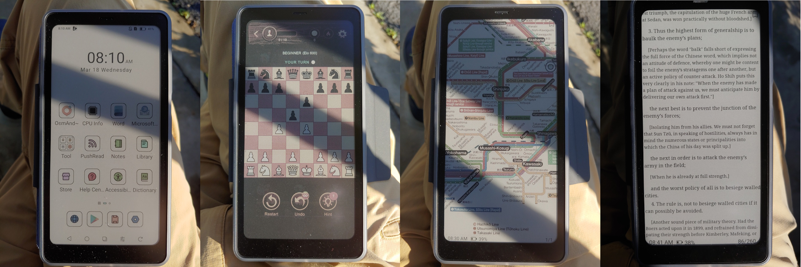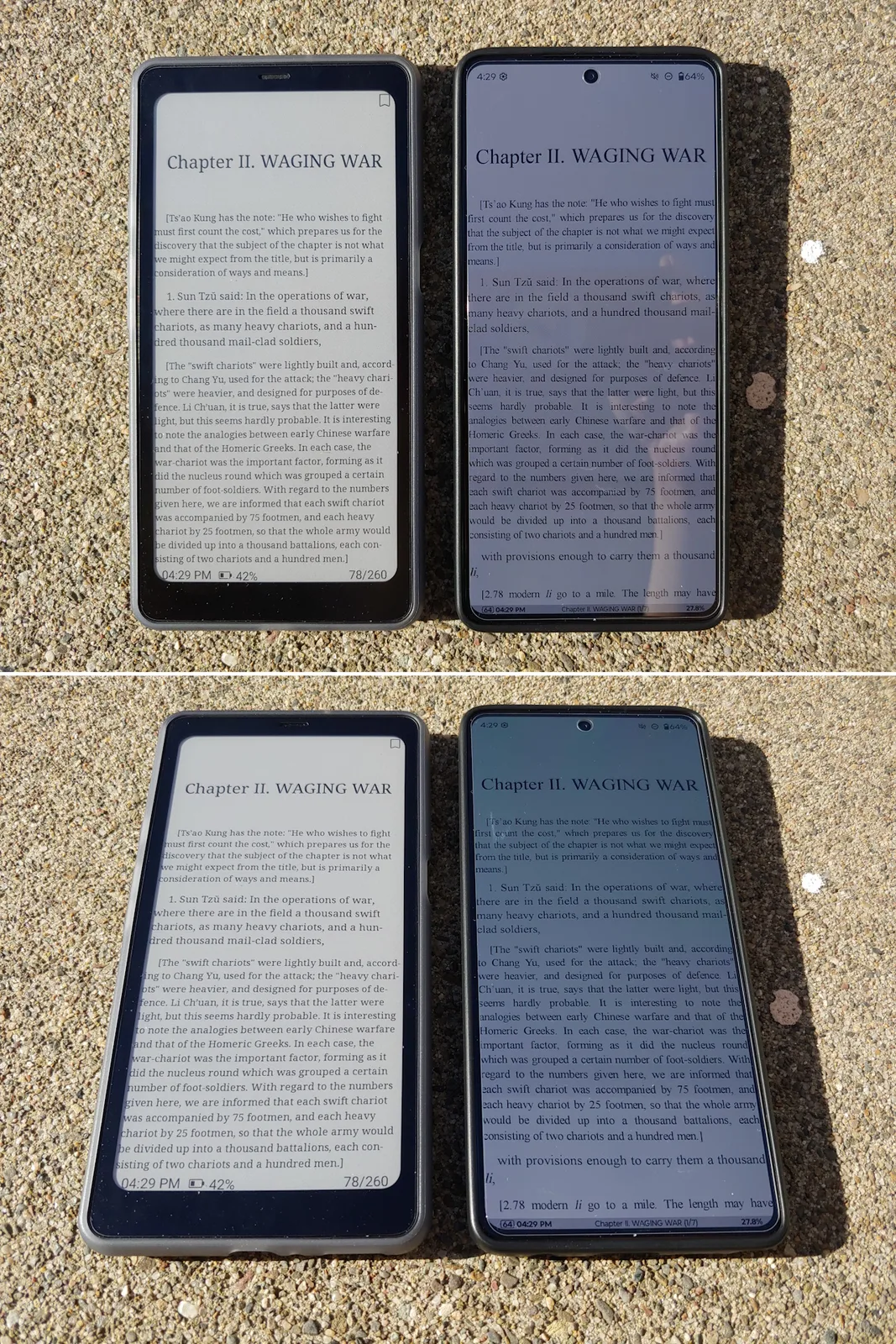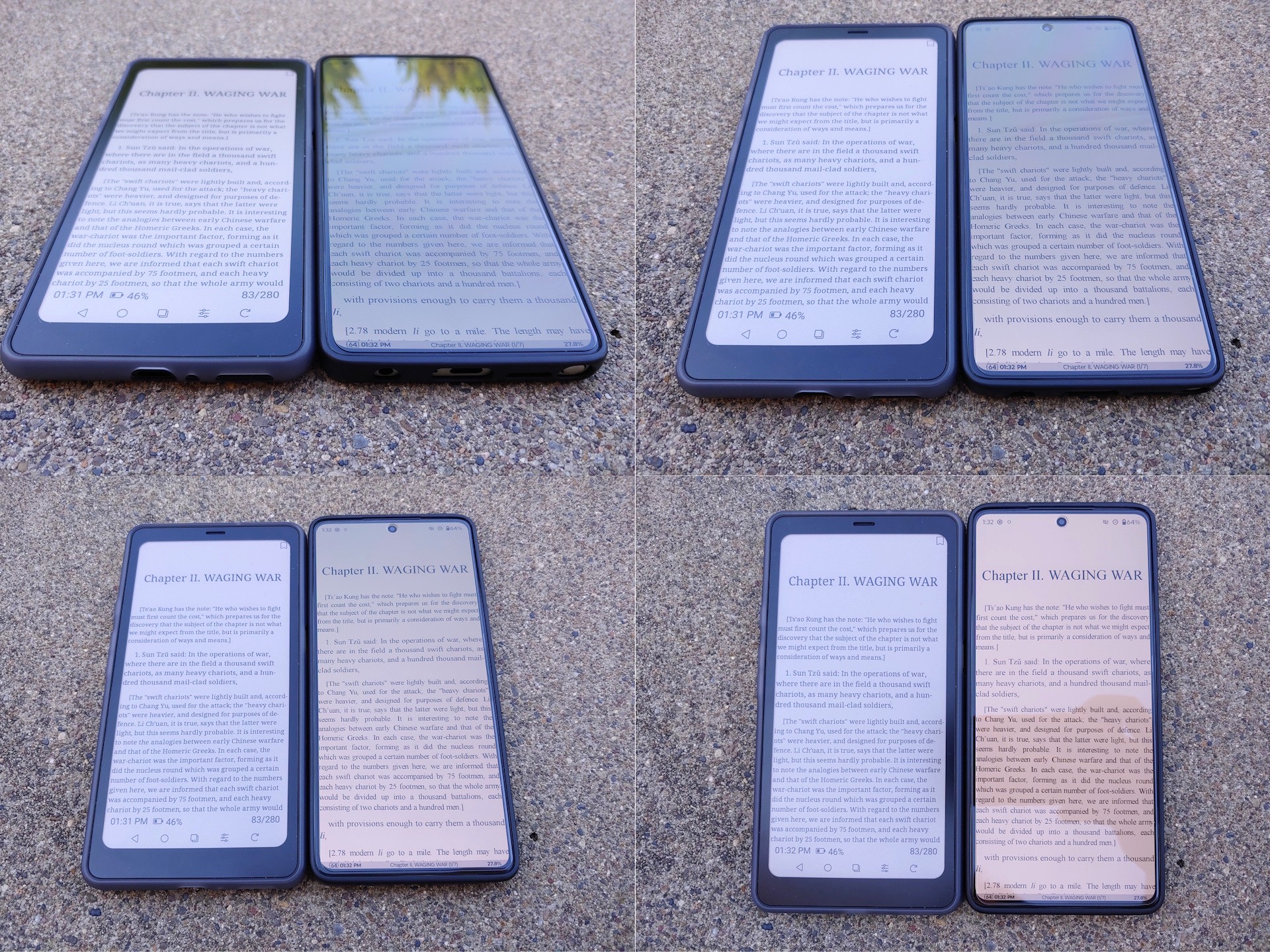 I direkt sol är Kaleido 3-displayen mycket mer läsbar än Moto G Stylus 2024 OLED med sin maximala automatiska ljusstyrka på 1 200 nit. I skugga är båda lika ljusa när Moto är inställd på sin ~550-nit manuella maxljusstyrka. E Ink-panelen förblir också läsbar i alla vinklar utan reflektioner eller färgskiftningar från OLED.
