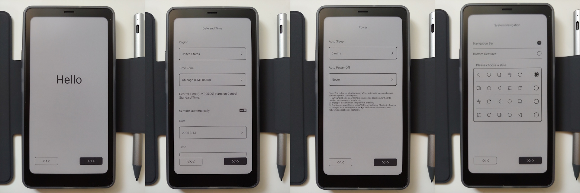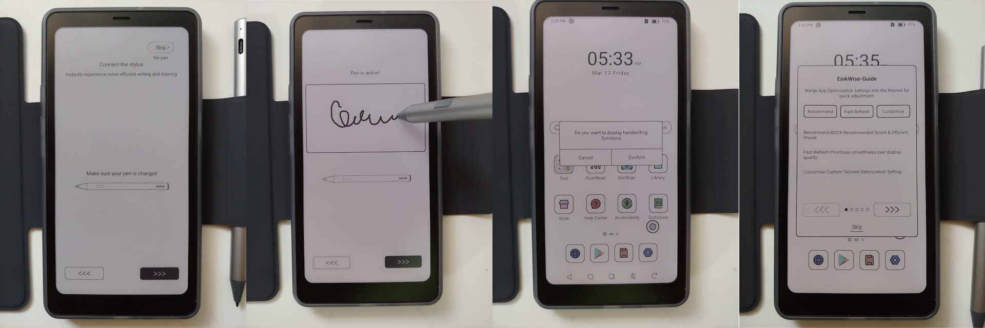 Installationen gick snabbt, med uppmaningar om språk, tid, GUI, penninställning och en EinkWise handledning innan du når hemskärmen. Det krävs inget Google-konto, men AI-assistenten kräver ett Onyx-konto.