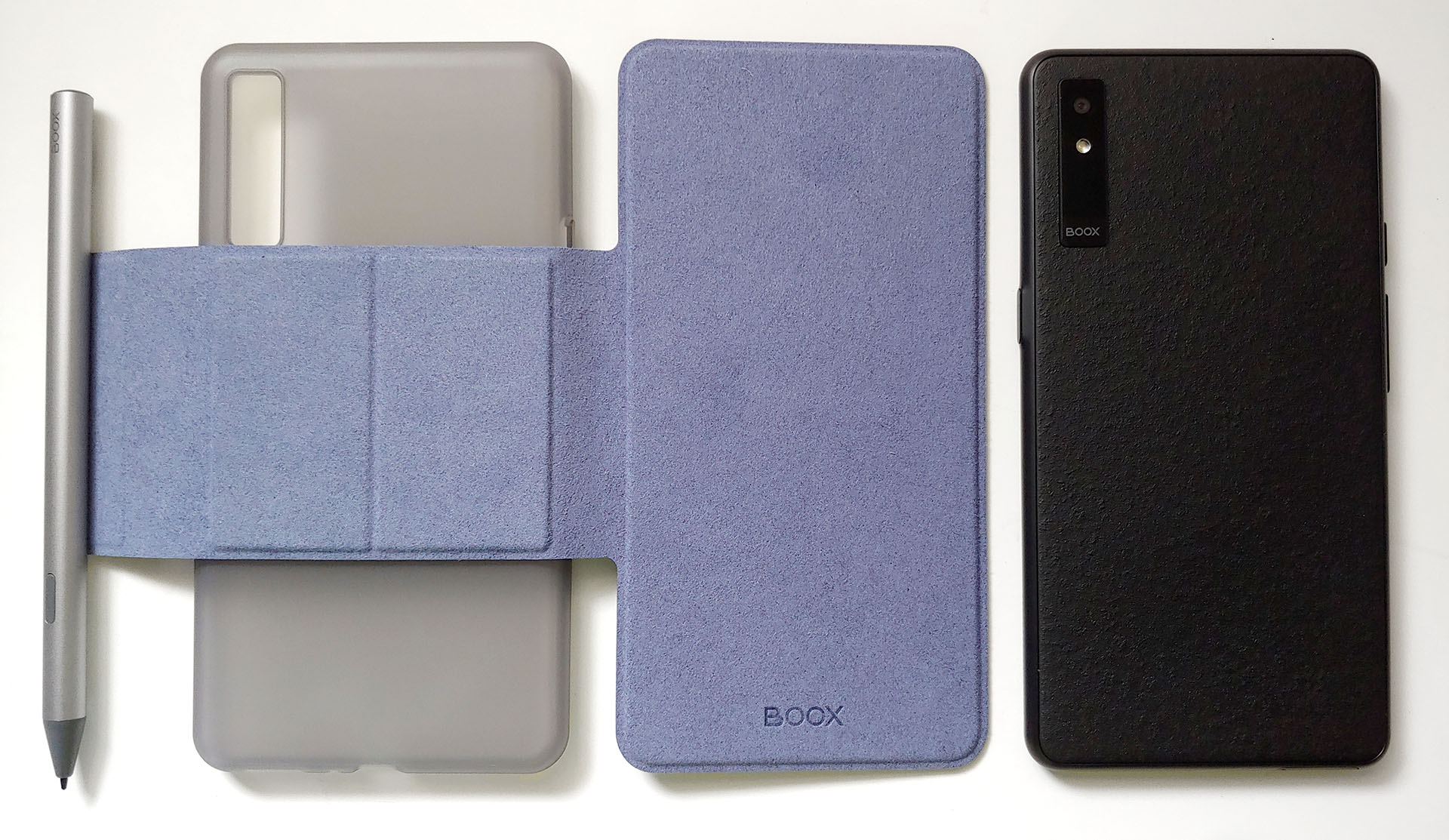 Läsplattan fungerar med en magnetisk penna och ett fodral. Pennan fästs på den nakna Boox-baksidan eller på fodralets flik. Booxen passar in i plastfodralet och fästs sedan magnetiskt på locket, som också kan slås loss ganska lätt.