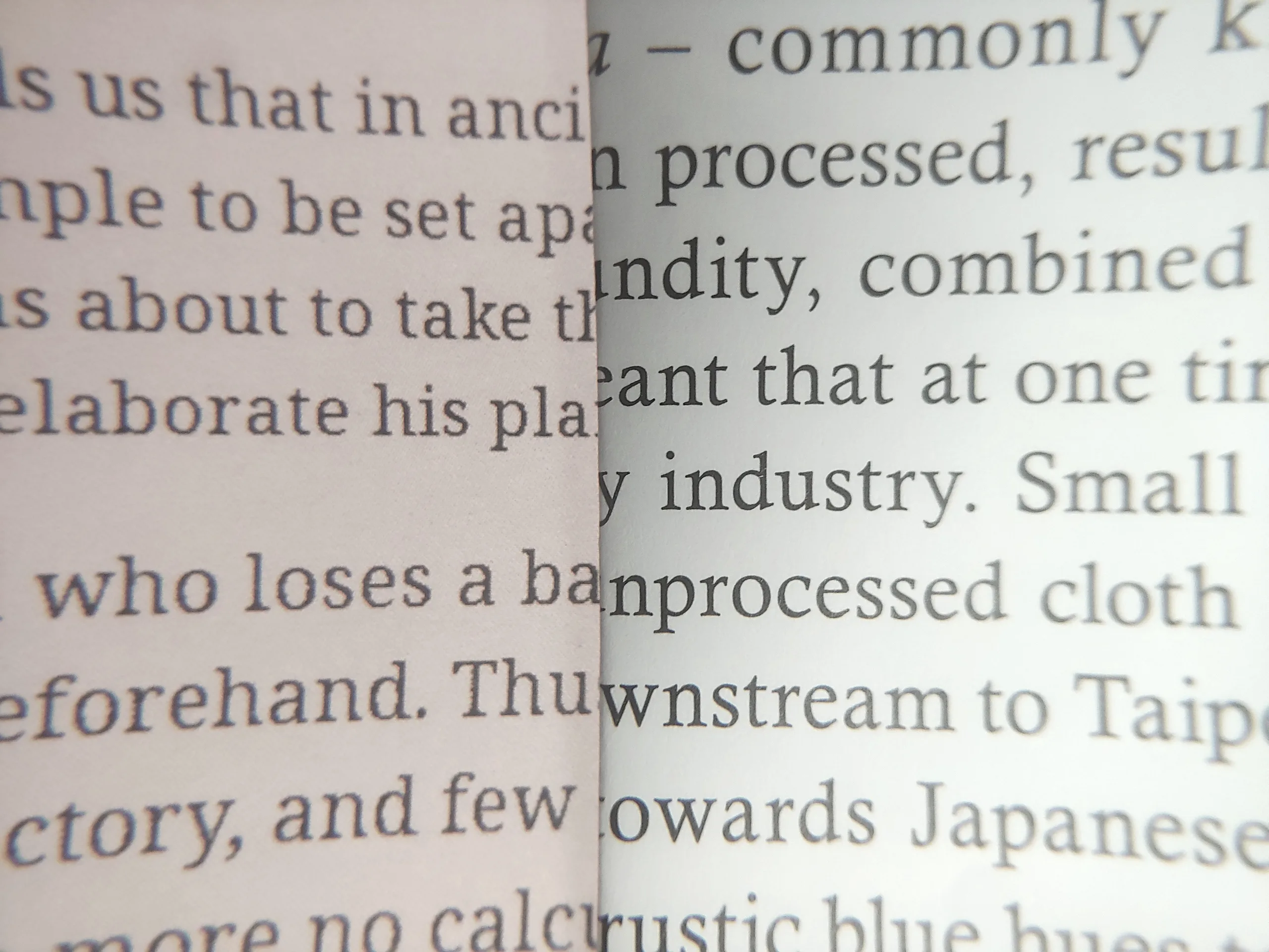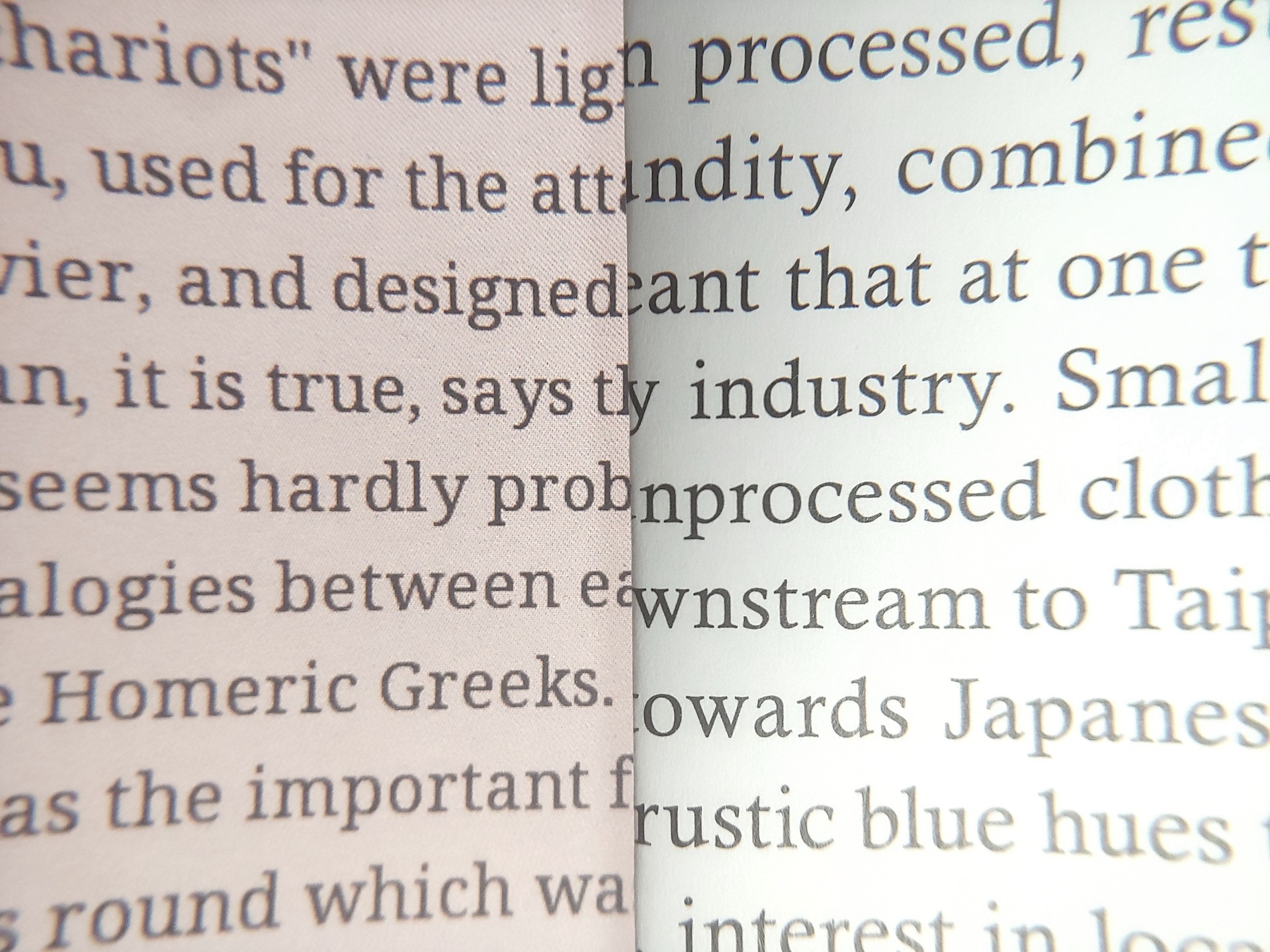 Pixlarna var synliga vid 8x förstoring. OLED-skärmen hade något renare textkanter, men ingen av dem matchade tidningstryck, och kanterna blev grövre när man bytte från Regal- till Speed-läge.