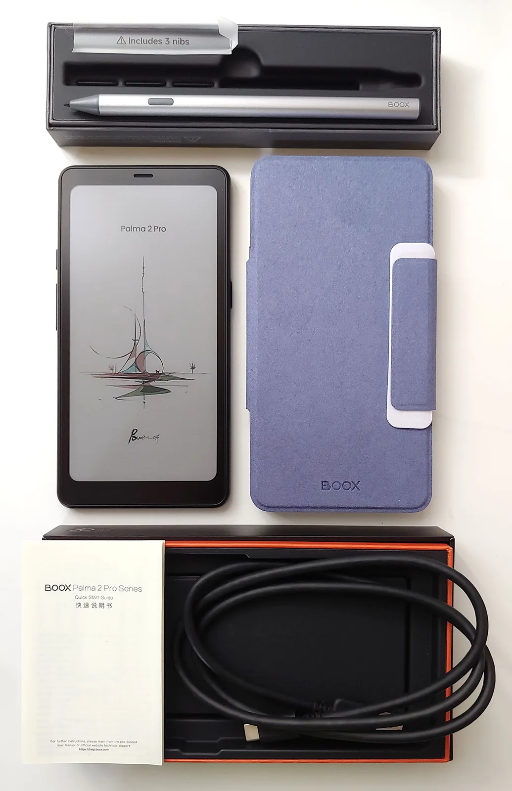 Läsplattan levererades med en USB-C-kabel, en snabbstartsguide och ett SIM-utmatningsverktyg, samt ett magnetiskt fodral och en penna med tre utbytesspetsar som tillval.
