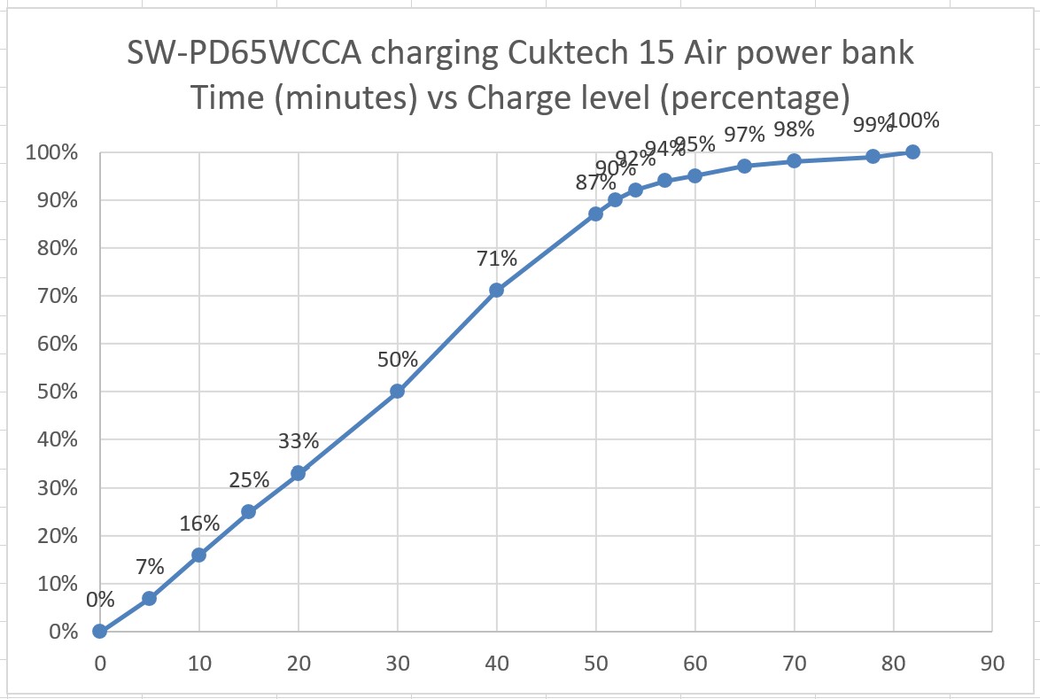 En Cuktech 15 Air powerbank (57,75 Wh) nådde full laddning något snabbare - ungefär fem minuters skillnad - med en Cuktech 10 Ultra (max 100-watts USB-C-utgång) jämfört med en SW-PD65WCCA (max 65-watts USB-C-utgång) med den medföljande 6A USB-C-kabeln. Laddningshastigheten var icke-linjär eftersom de flesta litiumjonbatterier laddas snabbare från 0 % till 80 % och sedan långsammare till 100 % av säkerhetsskäl.