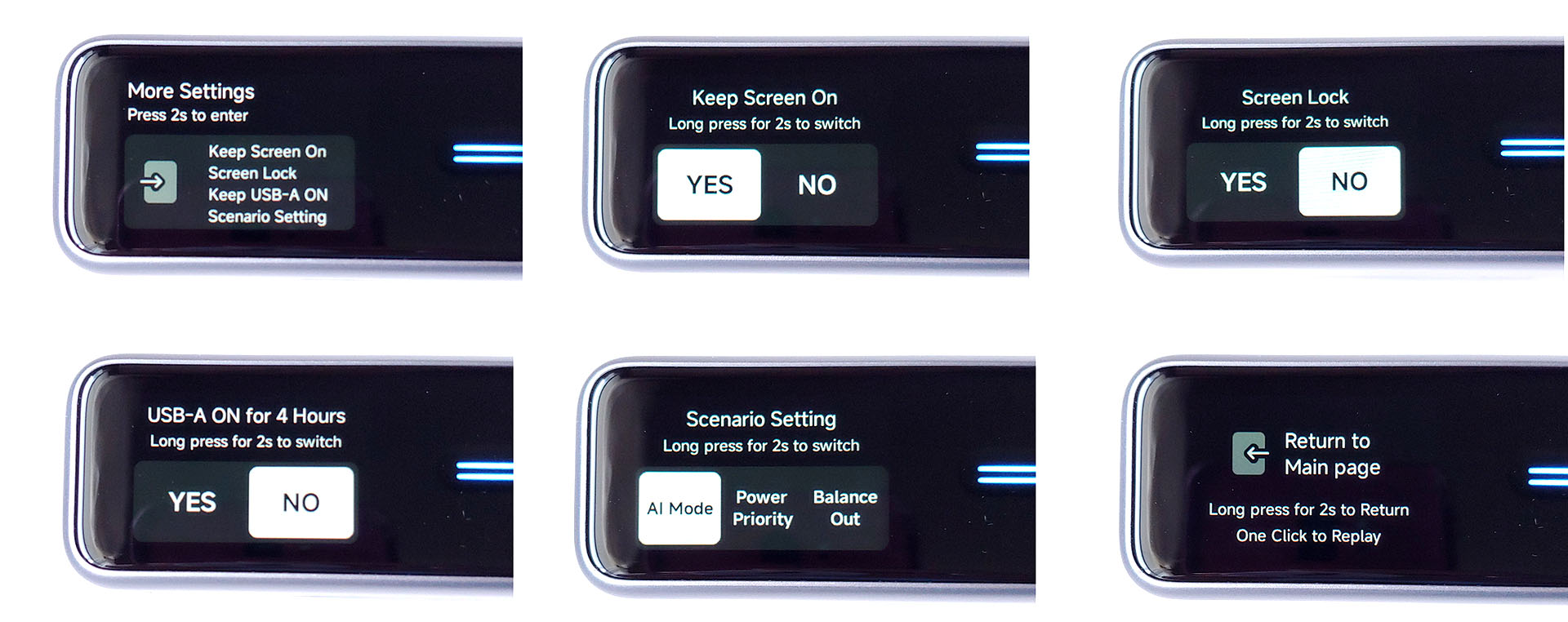 När du visar inställningarna växlar varje tvåsekunders tryckning status för varje inställning. Den viktigaste inställningen är strömförsörjningsläget - AI, Power Priority eller Balanced.