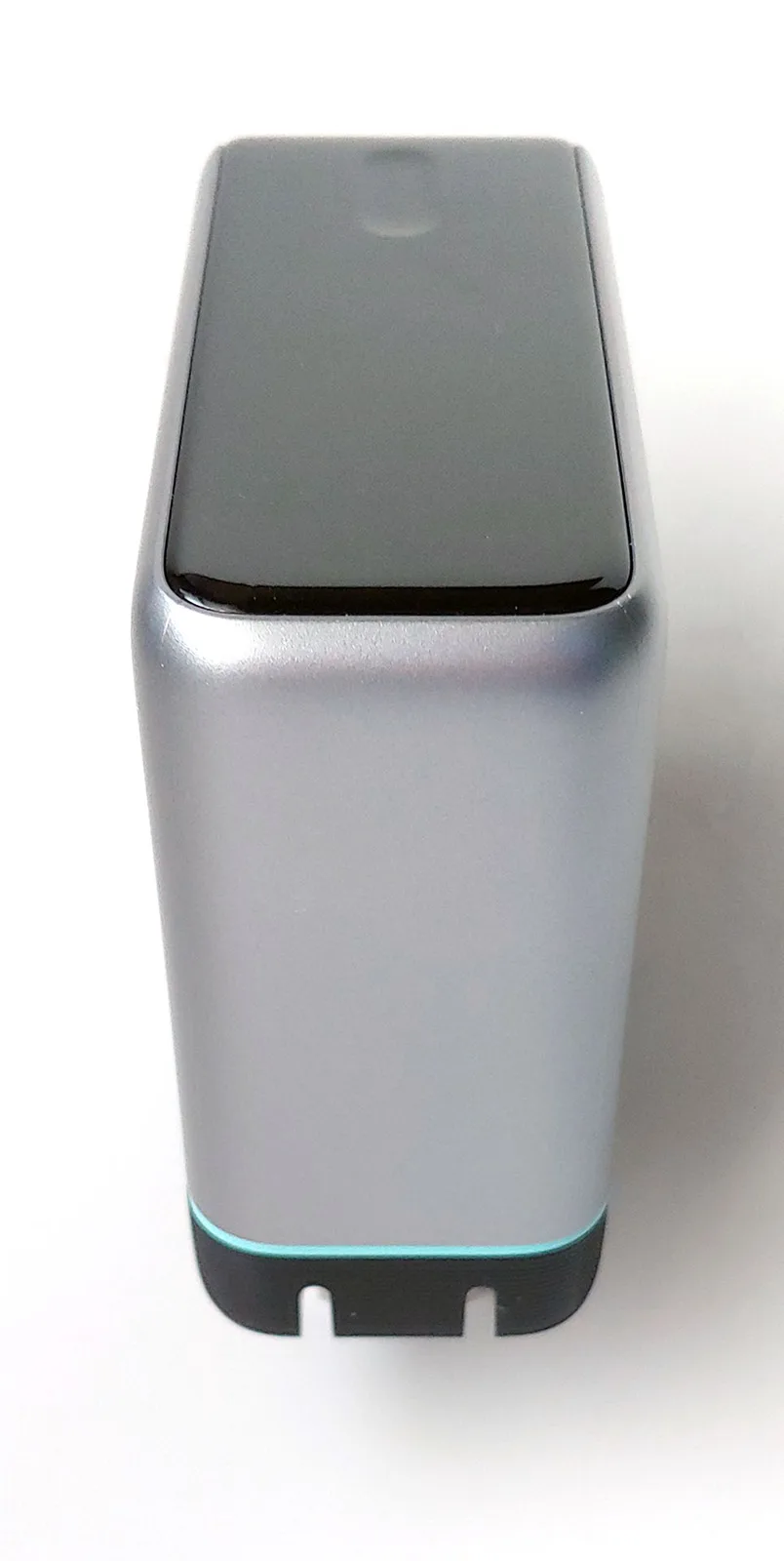 AC-laddaren har en enkel design med böjda kanter och platta sidor. Fyra USB-portar är placerade på framsidan - en USB-A-port och tre USB-C-portar - medan färgdisplayen och touchknappen är placerade längs toppen. Utfällbara AC-kontakter är placerade längs botten. Överlag har den en stilren design som är lätt att greppa och använda med en hand.