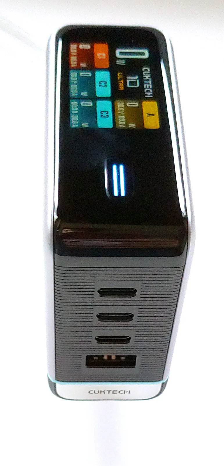 Cuktech 10 Ultra Cuktech 10 Ultra snabbladdar upp till fyra USB-enheter med en maximal effekt på 100 W för en port och 110 W för en kombinerad port. Färgskärmen visar watt, spänning och strömstyrka per port i realtid för att hjälpa till att övervaka laddningsförloppet. En touchknapp ger åtkomst till olika visningslägen och inställningar.