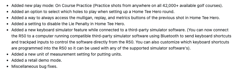 Med programvaruversion 4.80 får användare av Approach R50 en mängd nya funktioner. Det finns ett nytt spelläge, On Course Practice, som gör att du kan prova olika slag på över 42 000 golfbanor. Användarna kan nu välja vilket hål som ska spelas under en Home Tee Hero-runda, och du kan inaktivera Lie Penalty i det här läget. Dessutom kan användarna nu komma åt knapparna för mulligan, replay och mätvärden för det föregående slaget i Home Tee Hero.