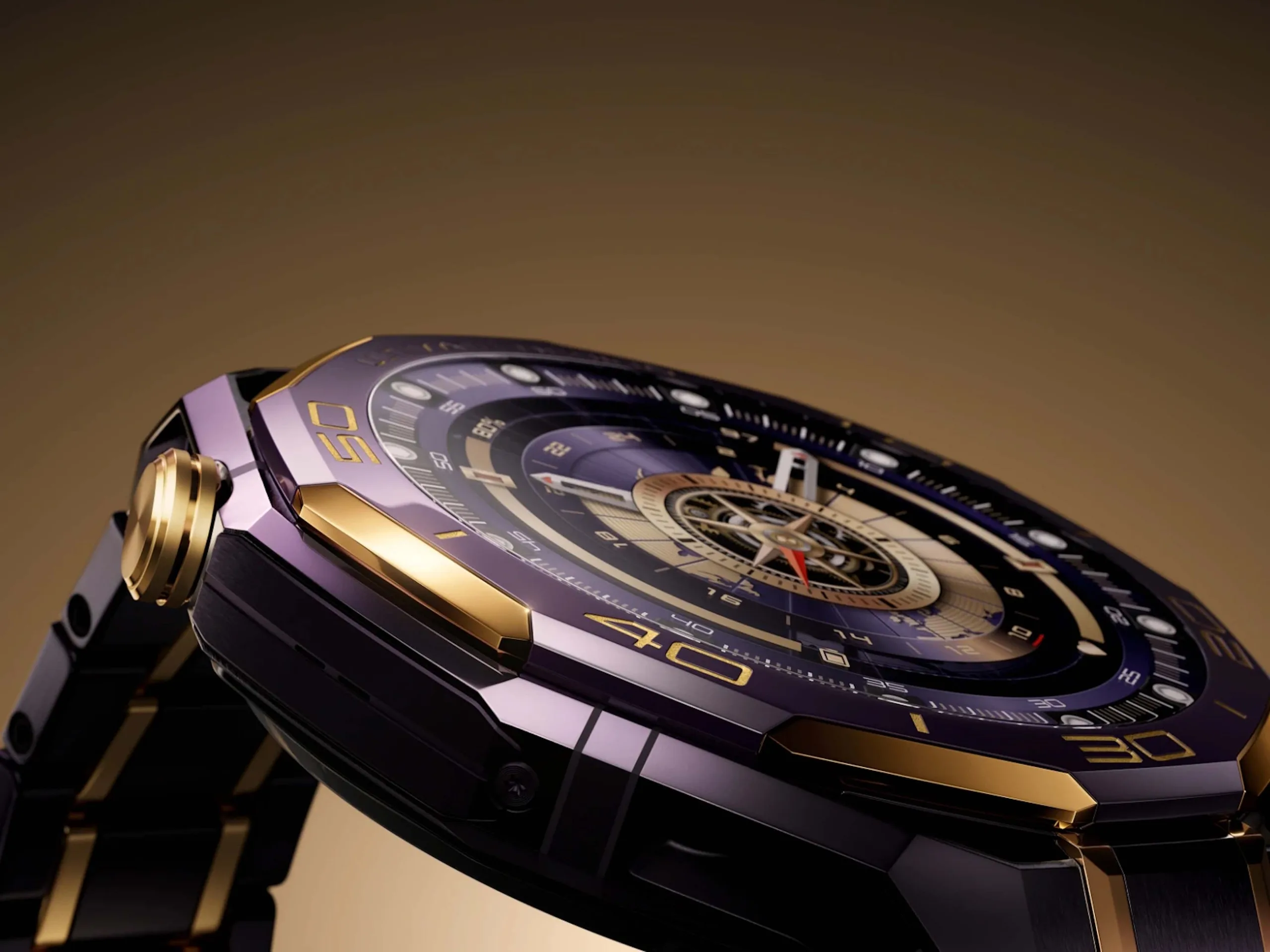 Huawei Watch Ultimate Design Royal Gold har en lila och guldfärgad design, med en keramisk ram med 18K och 24K guldaccenter. Höljet är tillverkat av en zirkoniumbaserad flytande metall, som sägs vara särskilt motståndskraftig, och det ihåliga höljet bidrar till att göra det lättare. Klockan levereras med ett slitstarkt lila och guldfärgat titanlegeringsarmband, urtavlan är skyddad av safirglas och kronan är också pläterad med 18K guld.