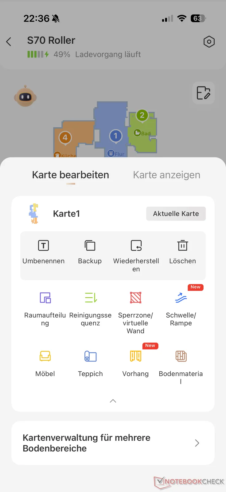 Mova-appen för S70 Roller erbjuder inte lika många alternativ som vi har sett på andra modeller, vilket också beror på de nedbantade funktionerna. Bland annat kan mattrengöringsbeteendet (mop på matta, rengör mattor först, mattboost, intensiv mattrengöring, sidoborste), MopExtend-funktionen och rengöringsstationen justeras. Praktiskt: Mattinställningarna kan också ställas in individuellt för varje matta. S70 Roller erbjuder inte live videoöverföring, men röststyrning (ej röststyrning) på flera språk finns ombord.