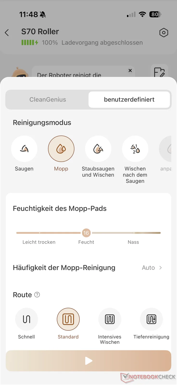 I översikten över enhetens ingång visar appen live-framstegen på den virtuella kartan på vanligt sätt när robotdammsugaren arbetar. De fyra klassiska lägena "Dammsug", "Moppa", "Dammsug och moppa" och "Moppa efter dammsugning" finns tillgängliga för detta. Sug- och moppeffekten för enskilda områden kan också ställas in via "Customize". Sugkraften kan ställas in i fyra nivåer (Tyst, Standard, Intensiv, Max) och moppningsfuktigheten i 32 nivåer. Det finns också fyra ruttalternativ (snabb, standard, intensiv moppning och djuprengöring).