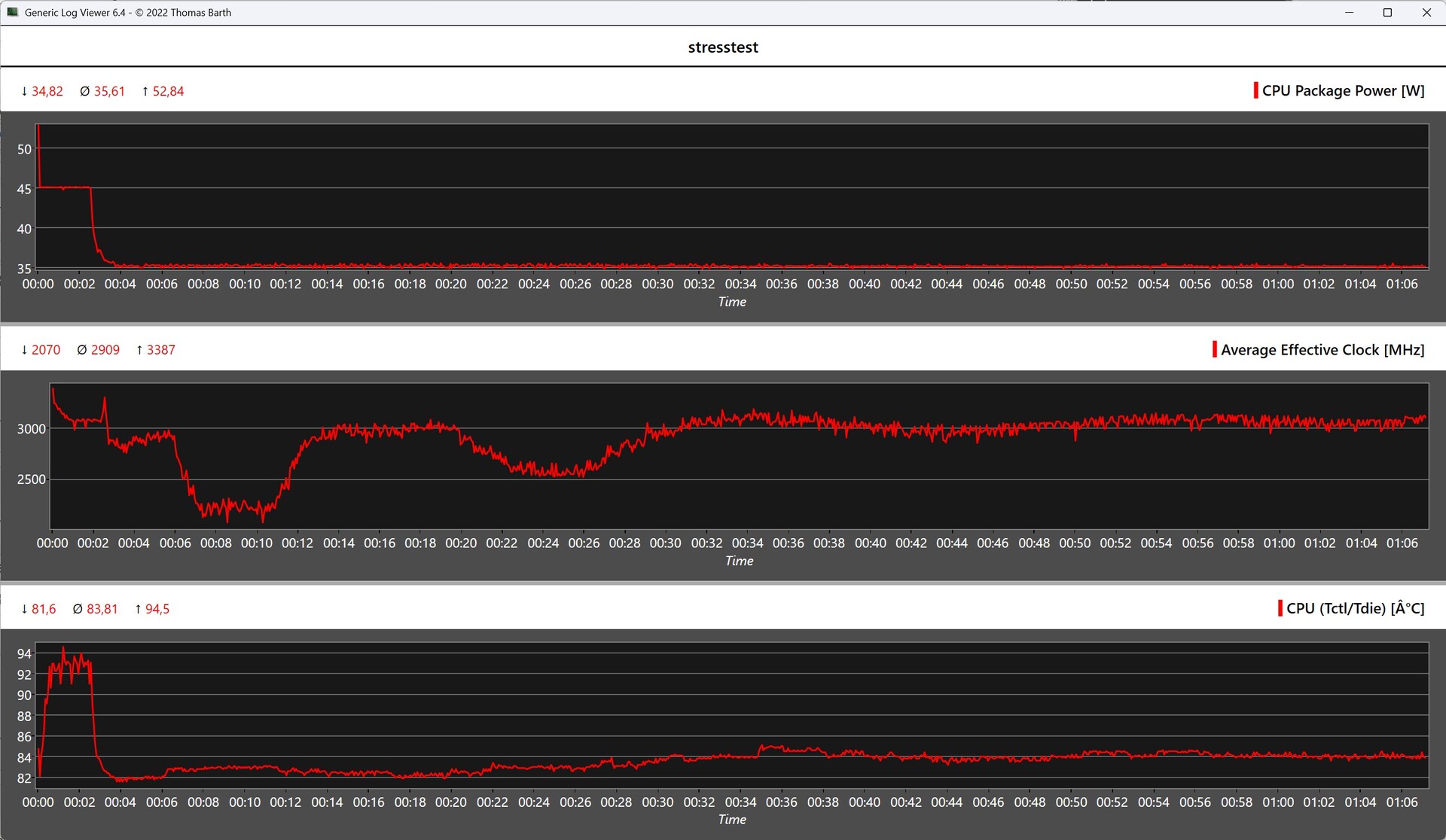 Tack vare den sofistikerade kyldesignen förblir höljet på Alliwava H90 Pro övervägande svalt även under hög belastning. Endast i området för de bakre ventilationsöppningarna finns det en märkbar uppvärmning. I stresstestet når AMD Ryzen 7 8745HS kortvarigt temperaturer på cirka 94 C, men detta ligger fortfarande inom det säkra området. Den genomsnittliga strömförbrukningen för APU:n ligger på cirka 35 watt.