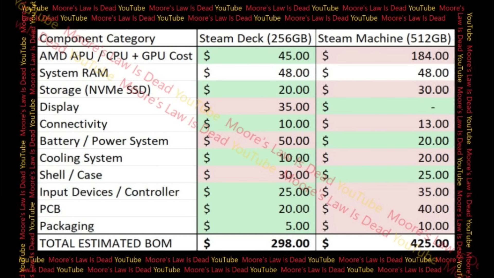 MLID: s grova BOM-uppskattning för Steam Machine sätter hårdvarukostnaden till cirka $ 425 mot $ 298 för Steam Deck(Finns på Amazon). Eftersom Valve säljer 256 GB Steam Deck för 399 $, kan Steam Machine prissättas till cirka 570 $ om Valve bibehåller samma 34% prispremie. Naturligtvis inkluderar MLID: s uppskattade Steam Machine-pris inte FoU och andra tillhörande kostnader.