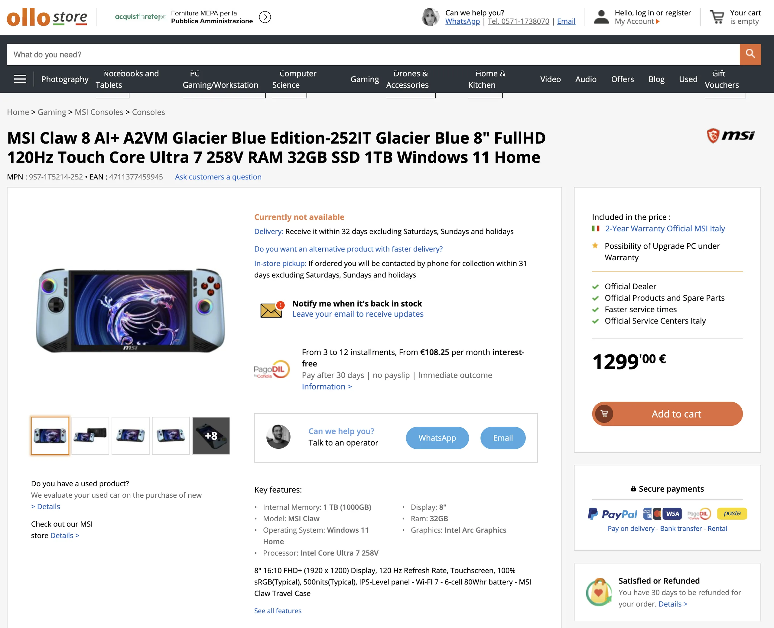 Som skärmdumpen nedan visar har Ollo Store prissatt Glacier Blue Edition till € 1,299 (~ $ 1,520) med samma Core Ultra 7 258V processor, 32 GB RAM och 1 TB lagringsutrymme som Sandstorm-varianten som vi granskade förra året. För sammanhanget säljs den senare för närvarande för 1 049 € (~ 1 229 $) i Italien. Tyvärr har MSI inte föreslagit att det kommer att sälja dessa Glacier Blue sidoplattor separat. Mer information om Glacier Blue Edition finns på MSI: s globala webbplats.