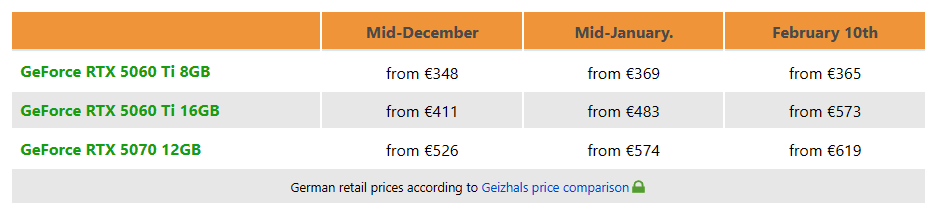 Där RTX 5060 Ti 16 GB enligt uppgift satt på 411 € mot RTX 5070: s 526 € pris i mitten av december, är RTX 5060 Ti 16 GB nu bara 46 € bakom RTX 5070.