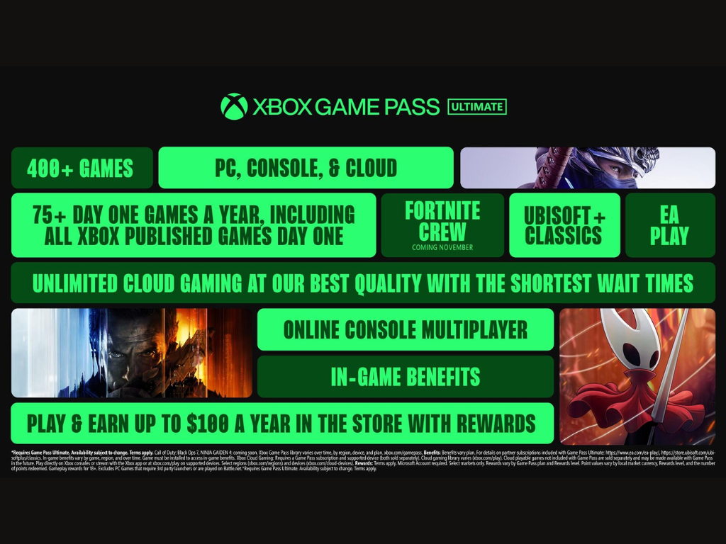 Detta tillägg introducerar 14 Assassin's Creed-spel inklusive Assassin's Creed IV Black Flag, Assassin's Creed: The Ezio Collection, Assassin's Creed Unity, tillsammans med andra Ubisoft-klassiker som Far Cry 3 och dess Blood Dragon DLC, Prince of Persia: The Lost Crown, The Crew 2, Watch Dogs och Tom Clancy's Ghost Recon: Breakpoint, alla tillgängliga på moln-PC och Xbox, vilket ökar Game Pass Ultimates bibliotek till över 400 spel. Dessutom kommer Game Pass Ultimate att innehålla mer än 75 dag 1-releaser årligen och förmåner som Fortnite Crew.