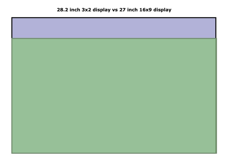 Det unika bildförhållandet ger mycket utrymme i vertikalled, vilket gör att användarna snabbt kan bläddra igenom kalkylblad och dokument. Som framgår av bilden ovan är en 28,2-tums 3:2-skärm i princip en förlängd 27-tums 16:9-skärm.