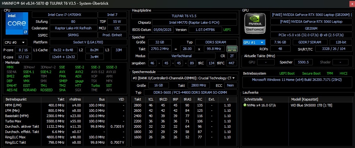 | Tulpar T6 V3.5 Intel Core i7-14700HX ⎘ NVIDIA GeForce RTX 5060 Laptop ⎘ 32 GB Minne, 1000 GB SSD | Listpris: 1160 EUR | 2.4 kg | 25 mm | 16.00" 1920x1200 142 PPI IPS | |