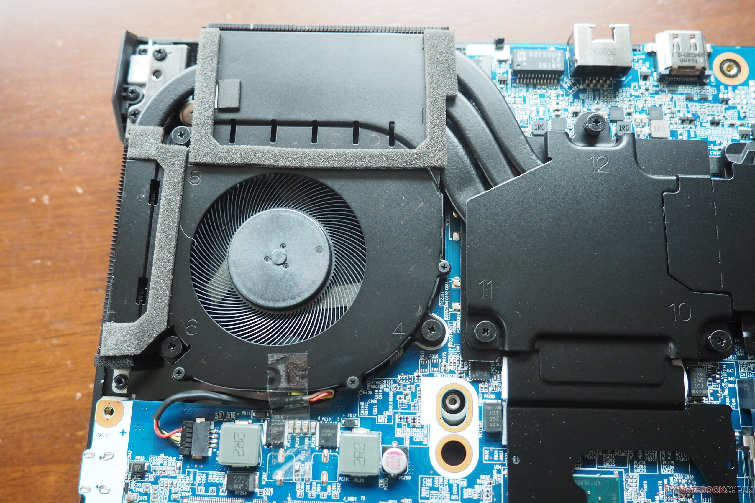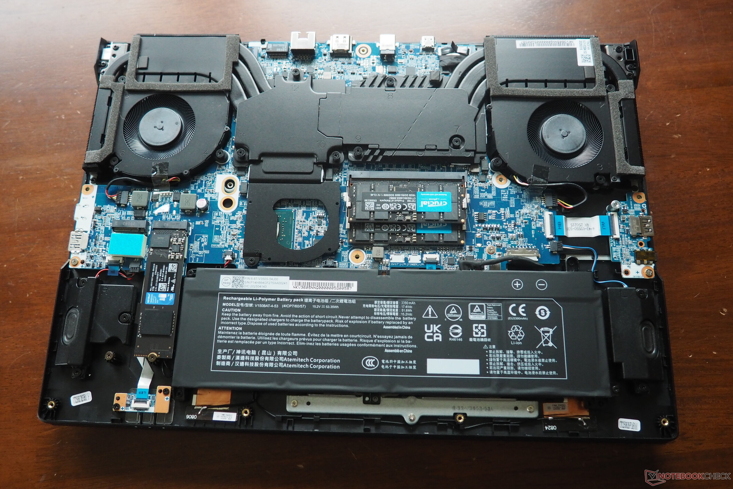 Totalt tolv Phillips-skruvar måste tas bort innan du kan bända loss bottenkåpan från dess fästen. Under huven hittar du ett kylsystem med två fläktar, tillsammans med två RAM-kortplatser och två SSD-kortplatser. Batteriet är också åtkomligt härifrån.