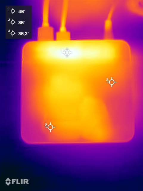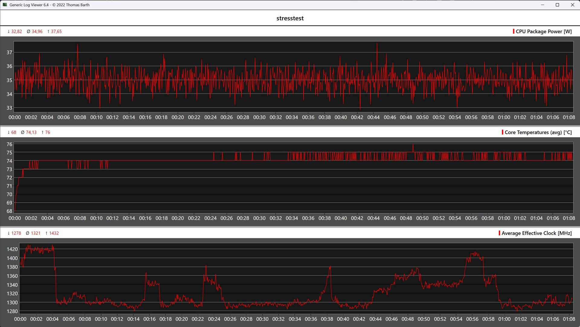 Under belastning värms höljet på GMKtec NucBox M3 Ultra upp märkbart och når ett toppvärde på nästan 50 C på undersidan. I stresstestet stiger Intel Core i7-12700H initialt till cirka 76 C och stabiliseras sedan vid cirka 74 C. SoC: s strömförbrukning fluktuerar något mellan 33 och 37 watt, även om ett genomsnitt på 35 watt uppnås.