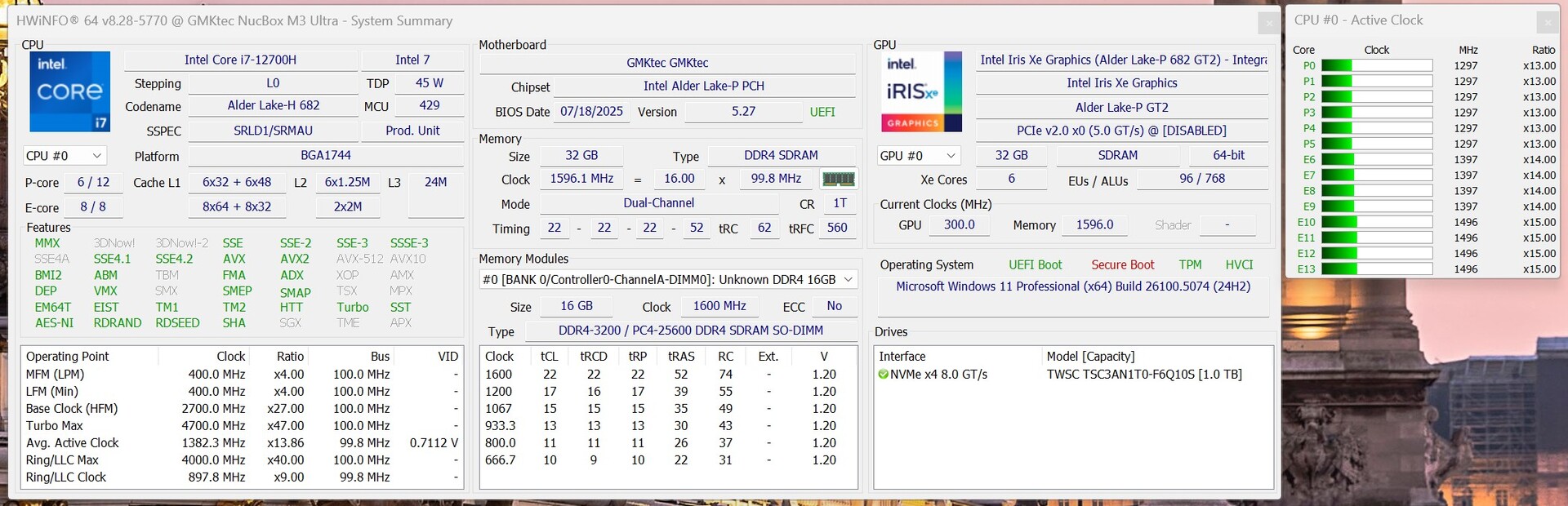 GMK NucBox M3 Ultra Intel Core i7-12700H ⎘ Intel Iris Xe Graphics G7 96EUs ⎘ 32 GB Minne, 1024 GB SSD | Amazon: $609.99 Listpris: 429€ | 437 g | 106 x 114 x 42.5 mm | |