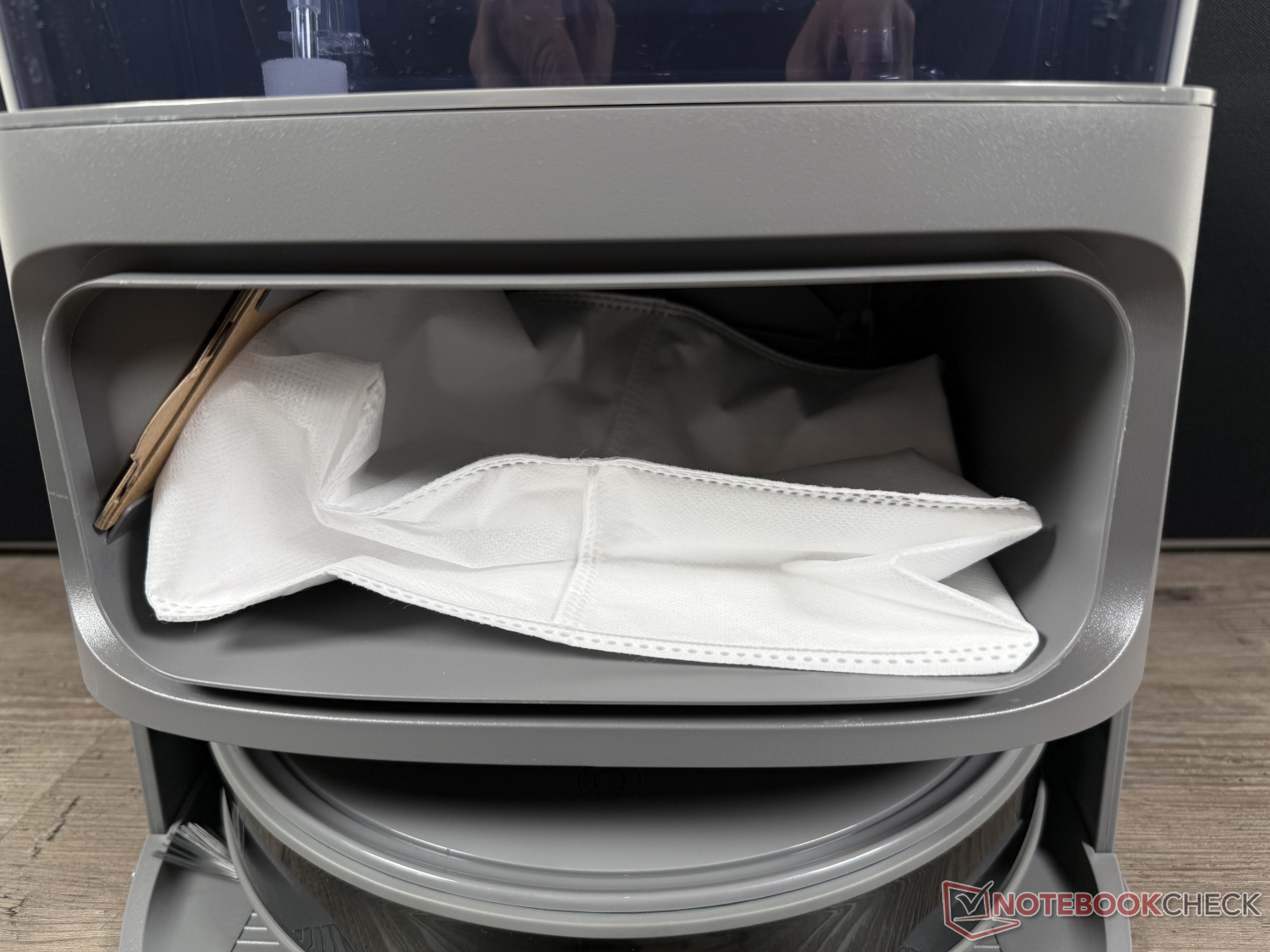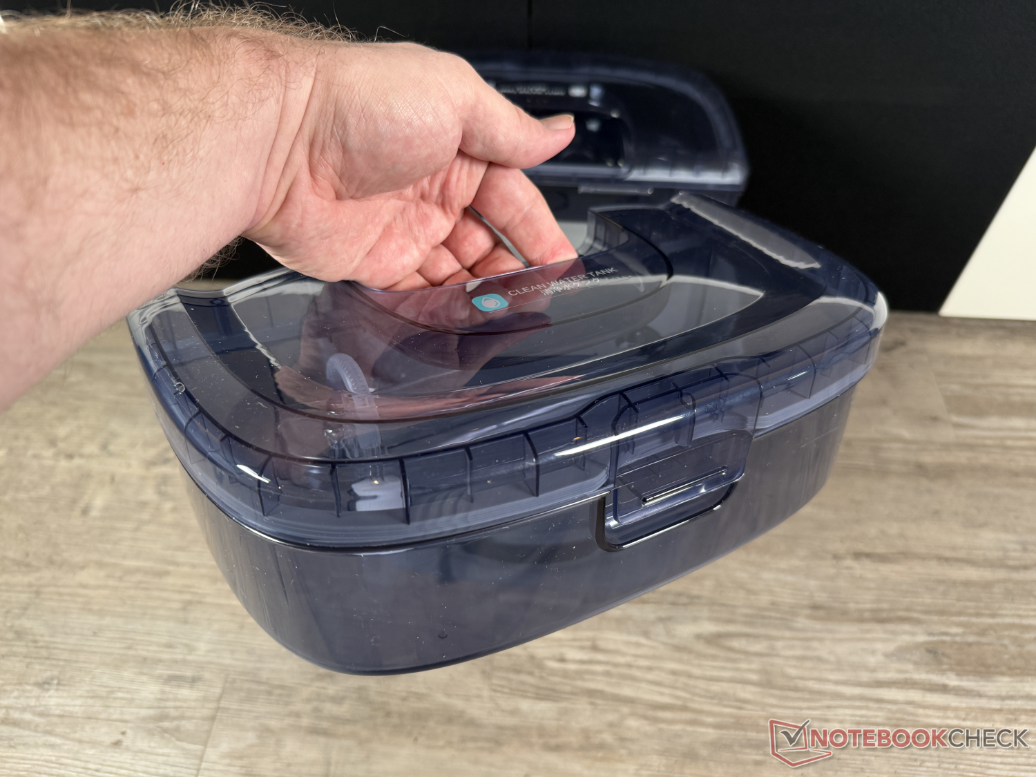 Den grå basstationen i fyrkantig design ser lite "billig" ut med sin högglansiga plast, men är kompakt med en höjd på ca 36 cm. Den innehåller en sugfunktion i en dammpåse samt rengöring av moppenheten med 45°C tempererat vatten, automatisk tvättmedelsdispenser och efterföljande torkning med luftflöde.