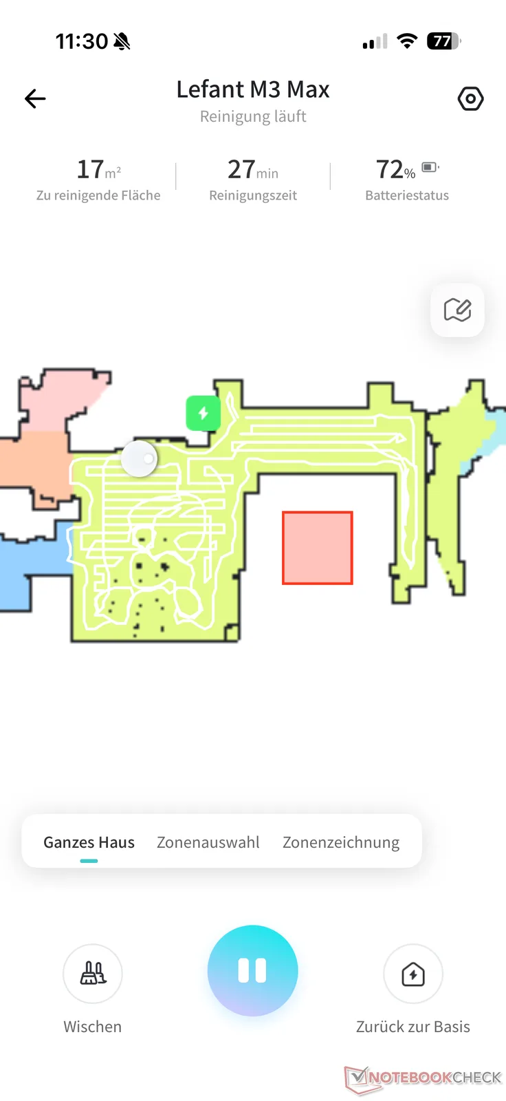 Lefant-appen erbjuder också ett anständigt, men inte omfattande urval av rengöringsalternativ. Roboten kan bara dammsuga och dammsuga och moppa, men inte bara moppa. Sugkraften kan justeras i fyra nivåer. Moppningsfuktigheten kan endast ställas in via längden på de enskilda intervallen tills robotarna återvänder till stationen för att återvätas. Praktiskt: Inställningen för varje rum kan ställas in individuellt under "Custom".