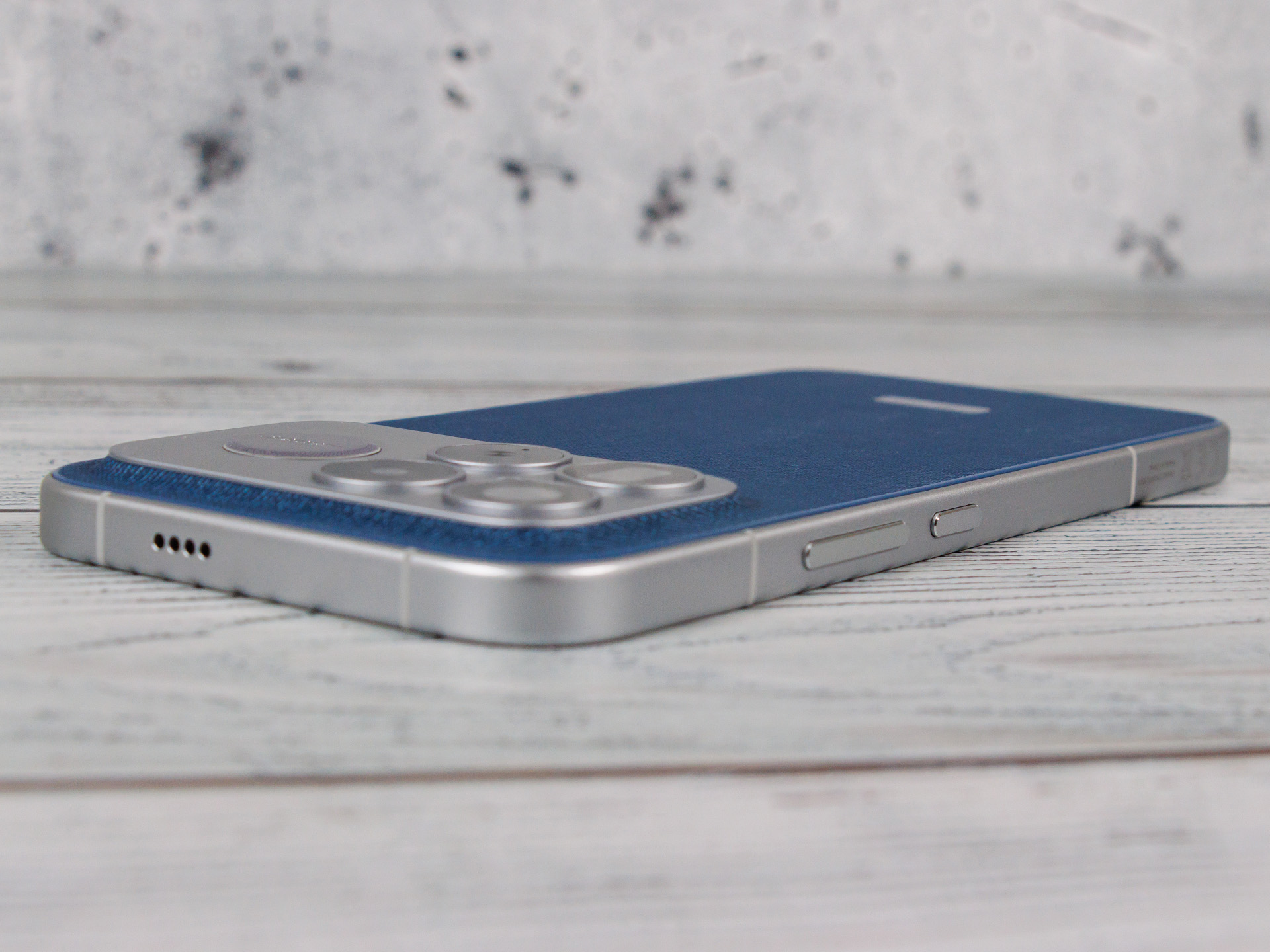 Poco F8 Ultra finns i färgvarianterna Black och Denim Blue. På den svarta modellen är ramen mattsvart och bakpanelen är tillverkad av en glasfiberkomposit. Den blå versionen använder däremot ett silikonhartsbaserat nanomaterial som är utformat för att efterlikna utseendet på denim, i kombination med en aluminiumram i matt silver. Chassit har en nominell tjocklek på 8,3 mm, vilket vi kunde bekräfta. Inklusive kameramodulen ökar tjockleken till upp till 11,9 mm.