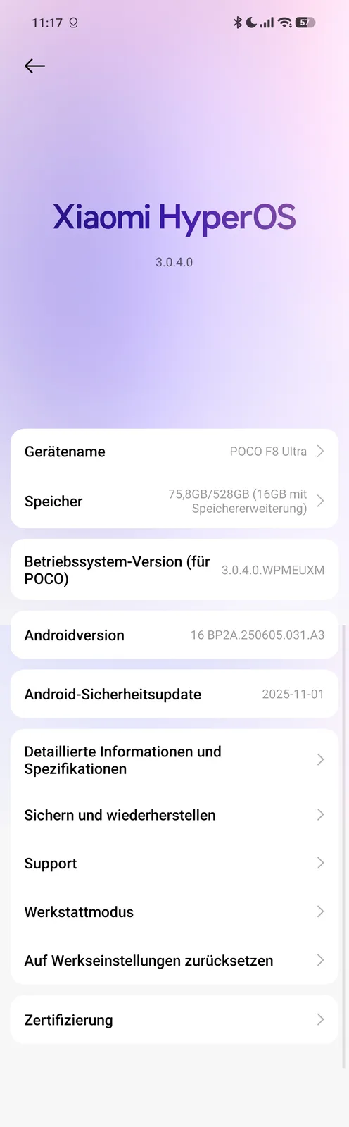 Poco F8 Ultra levereras med Google Android 16 och Xiaomis HyperOS 3.0. Enligt tillverkaren kommer den att få fyra år av Android versionsuppdateringar och ytterligare två år av säkerhetsfixar. Med tanke på enhetens avancerade ambitioner hade det varit önskvärt med längre mjukvarusupport.