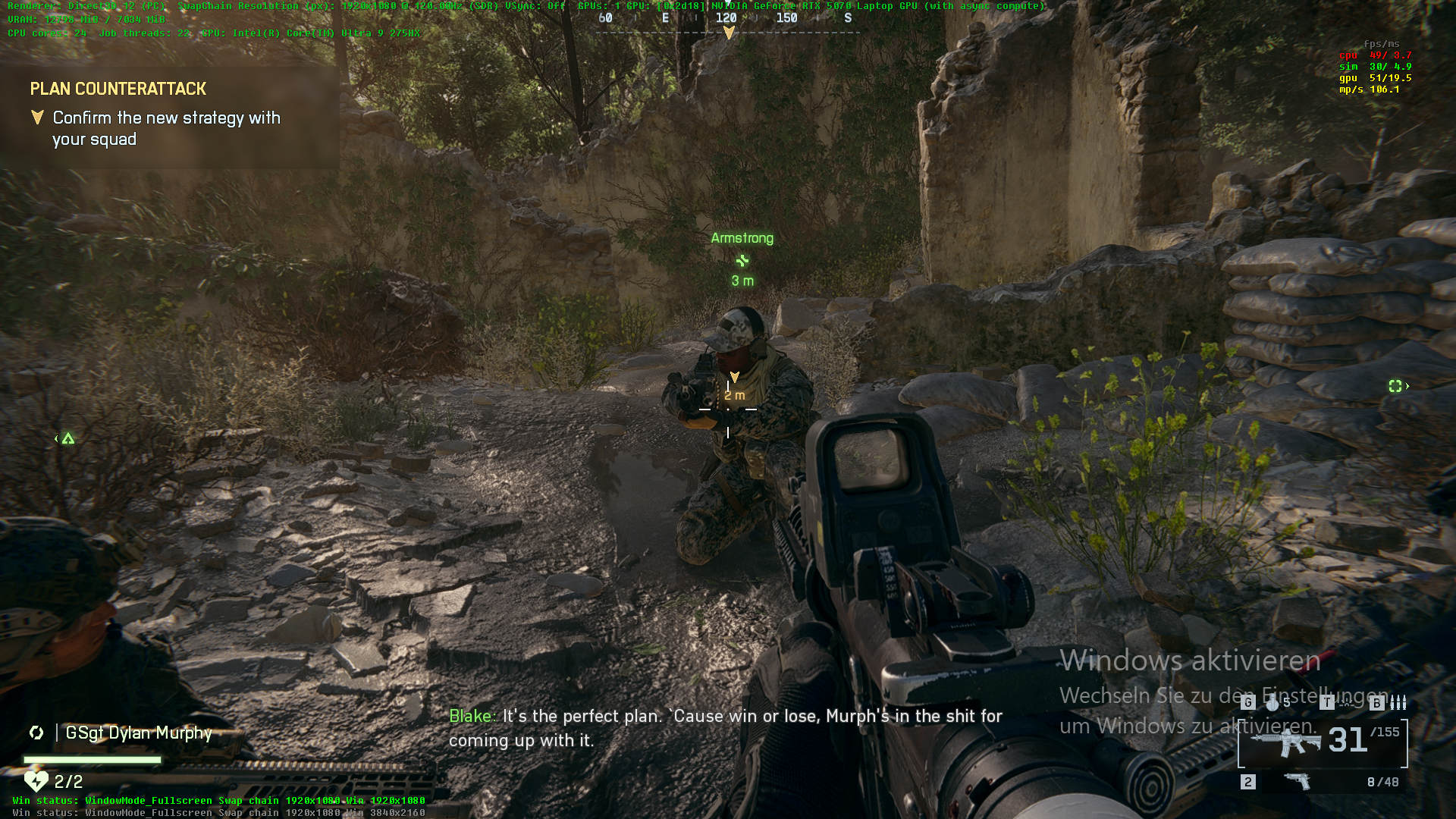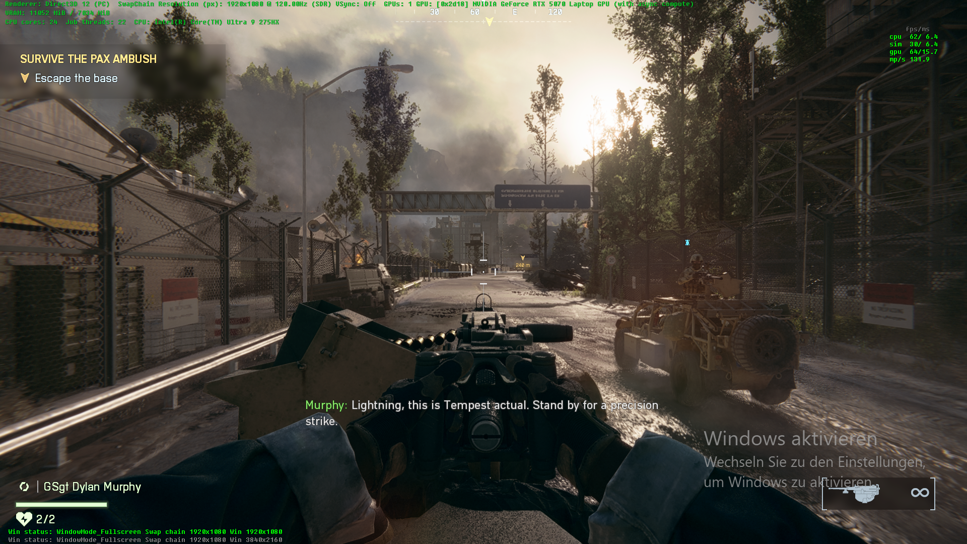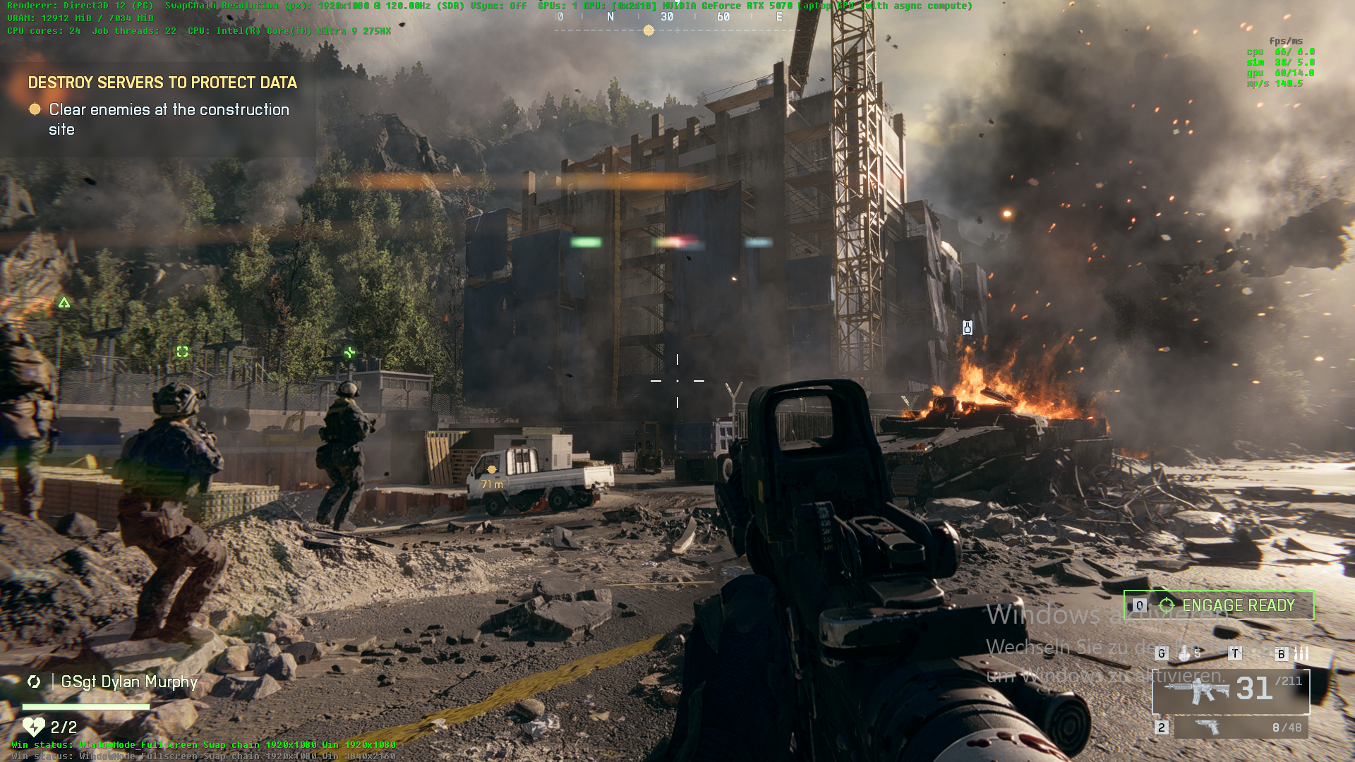 För multiplayer-matcher är det skillnad på om du spelar småskaliga eller storskaliga strider. En småskalig strid är inget problem i QHD och prestandan var stabil på RTX 5070. Detta förändras när du går med i en storskalig strid, där beteendet är identiskt med kampanjen och prestandan kommer att sjunka märkbart inom ett par minuter till den punkt där du inte kan spela smidigt längre. Om du respawn är situationen bättre men prestandan sjunker snabbt igen.