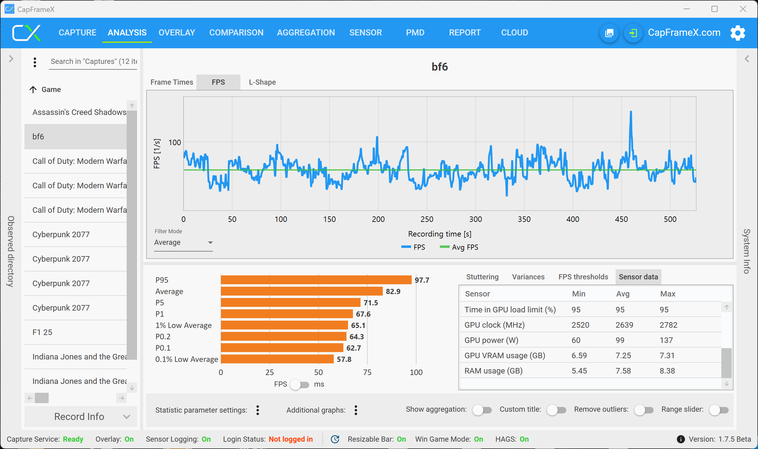 Battlefield 6 är ett intressant fall, eftersom du enkelt kan kontrollera fps-antalet (även fördelat över CPU/GPU) och även VRAM-användningen med de integrerade övervakningsverktygen. Vi började i Full-HD-upplösning och förinställningen Overkill, där VRAM-belastningen börjar på strax under 7 GB.