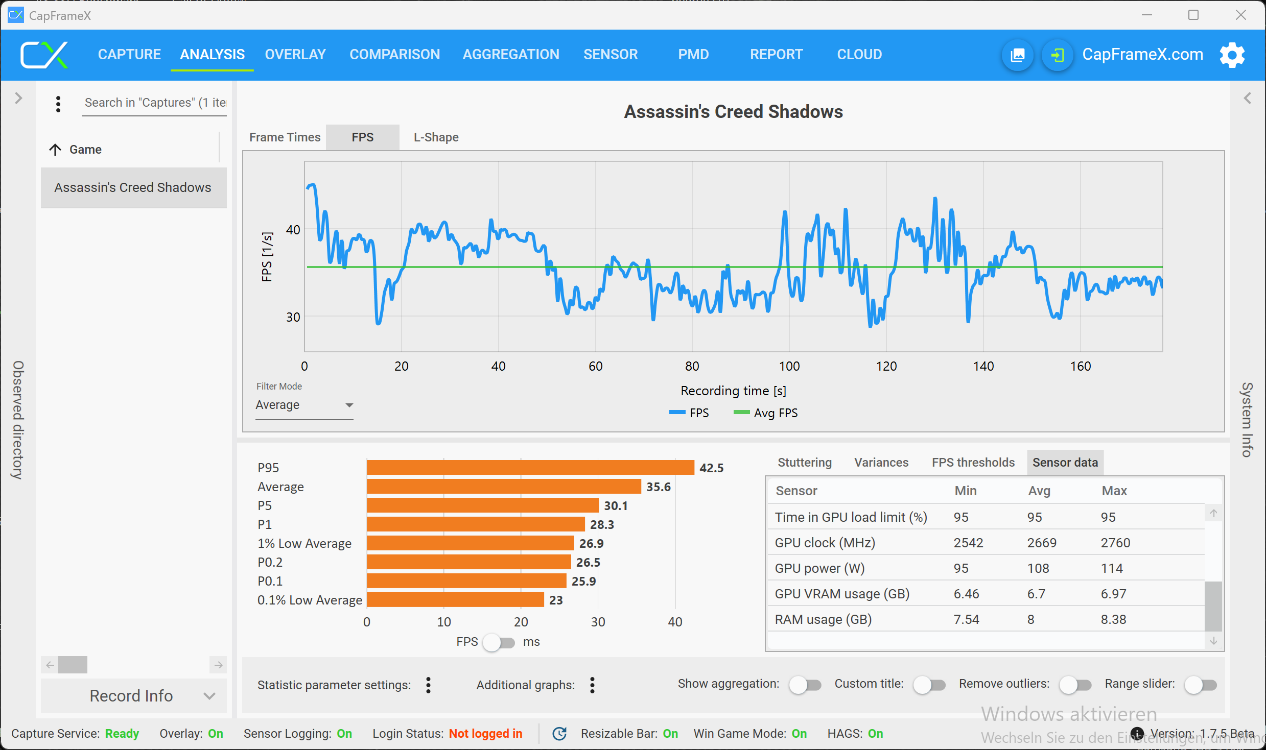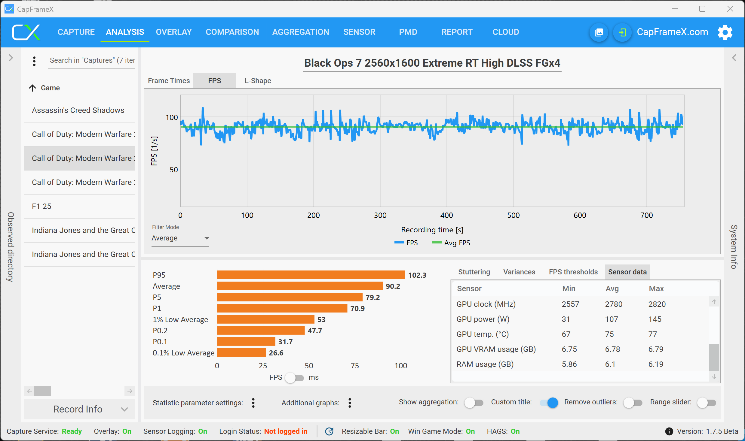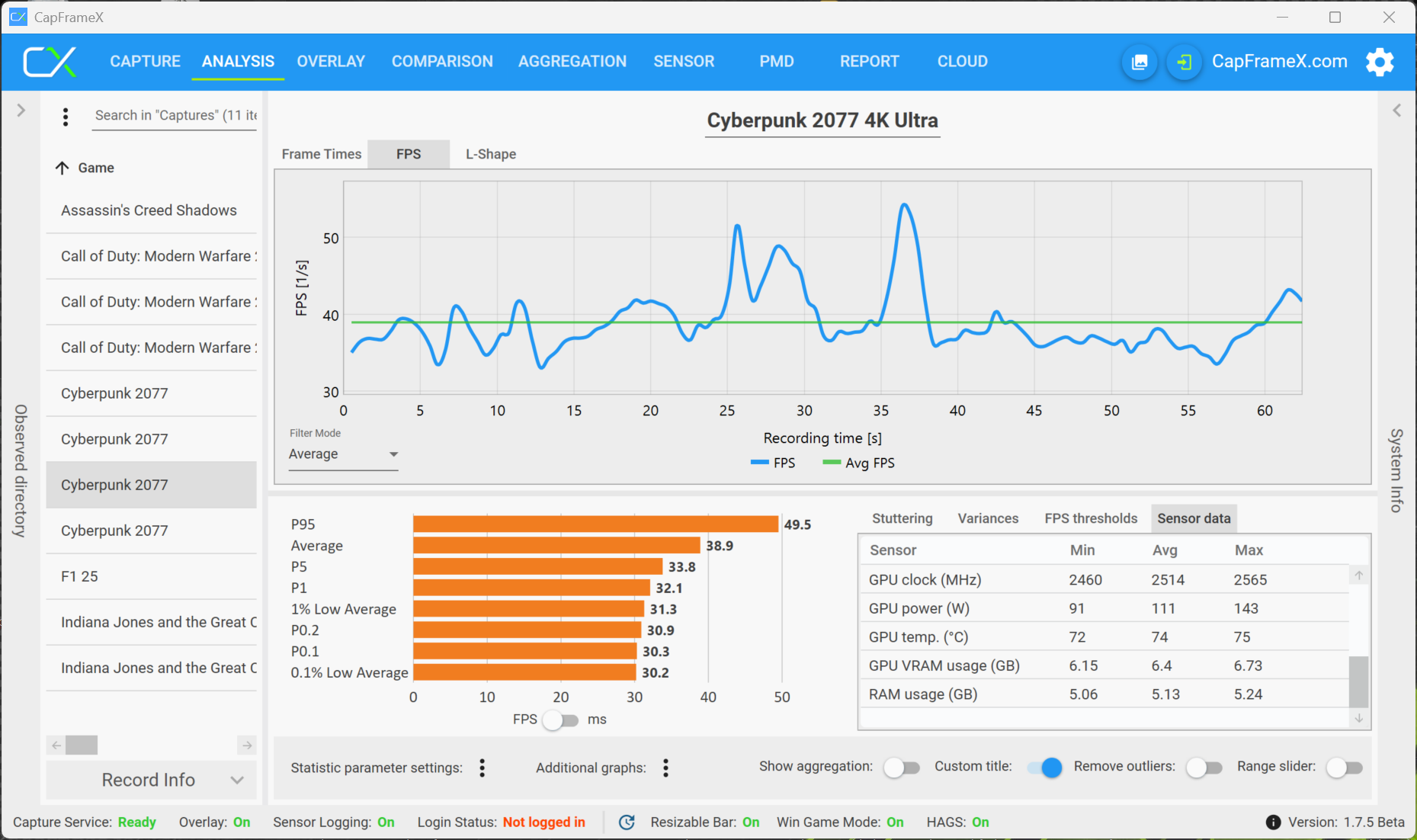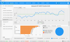 Det faktum att det finns en VRAM-varning betyder dock inte att du nödvändigtvis upplever problem när du spelar. Med maximal belastning för RTX 5070 (högsta VRAM-belastning, men fortfarande smidigt spelbart) använde vi inställningen 2560 x 1600 pixlar, Raytracing (High), DLSS och Frame Generation (QHD RT är inte spelbart utan DLSS, men samtidigt är 4K med RT inte alltid över 30 fps, trots DLSS och MFGx4) och spelade multiplayer. Som ett exempel visar följande analys en multiplayer-match, och det visar tydligt att det inte finns några begränsningar. RTX 5070 Ti med 12 GB VRAM har inga problem med 4K-upplösningen.