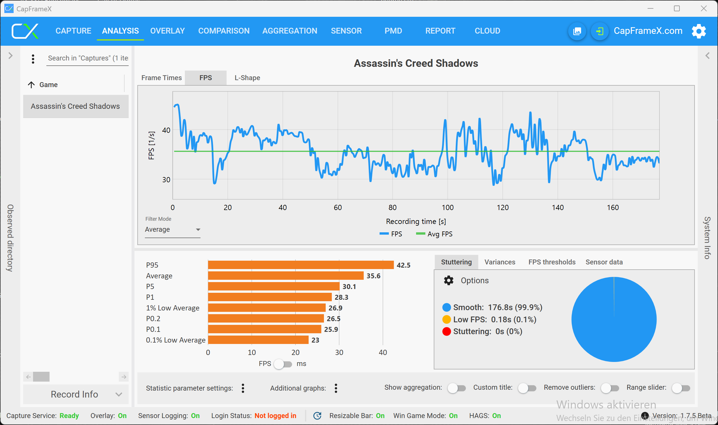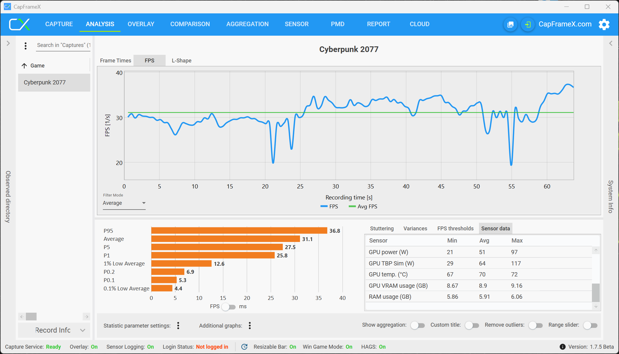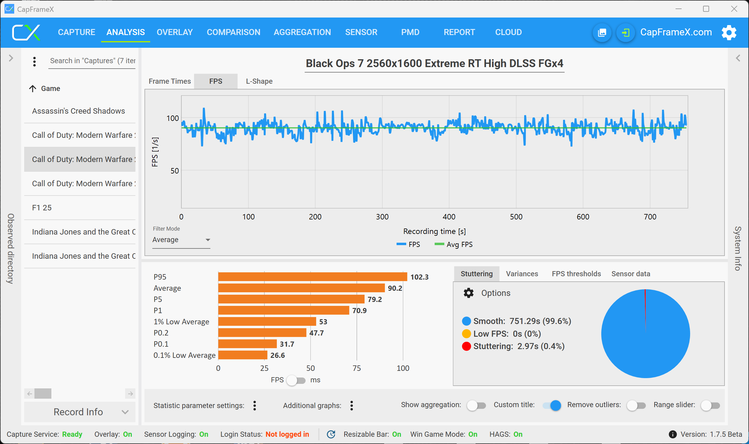 Det faktum att det finns en VRAM-varning betyder dock inte att du nödvändigtvis upplever problem när du spelar. Med maximal belastning för RTX 5070 (högsta VRAM-belastning, men fortfarande smidigt spelbart) använde vi inställningen 2560 x 1600 pixlar, Raytracing (High), DLSS och Frame Generation (QHD RT är inte spelbart utan DLSS, men samtidigt är 4K med RT inte alltid över 30 fps, trots DLSS och MFGx4) och spelade multiplayer. Som ett exempel visar följande analys en multiplayer-match, och det visar tydligt att det inte finns några begränsningar. RTX 5070 Ti med 12 GB VRAM har inga problem med 4K-upplösningen.