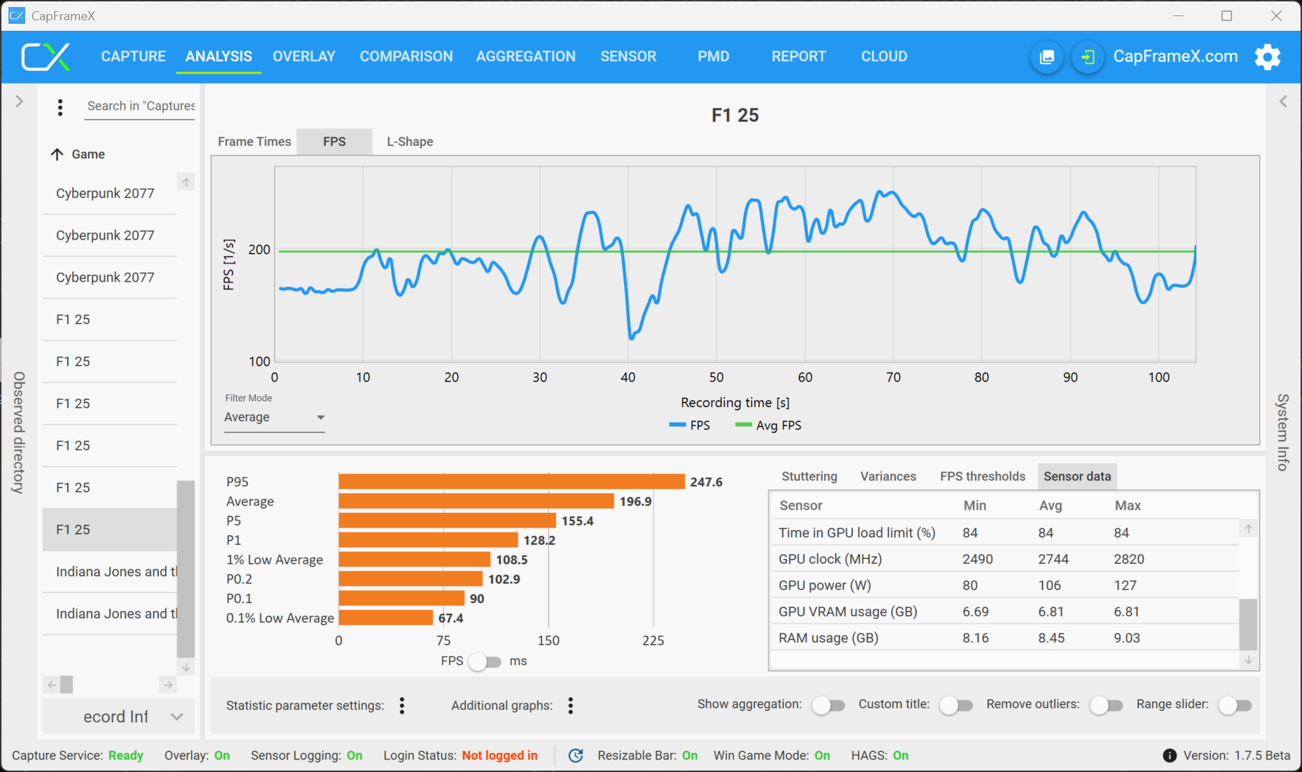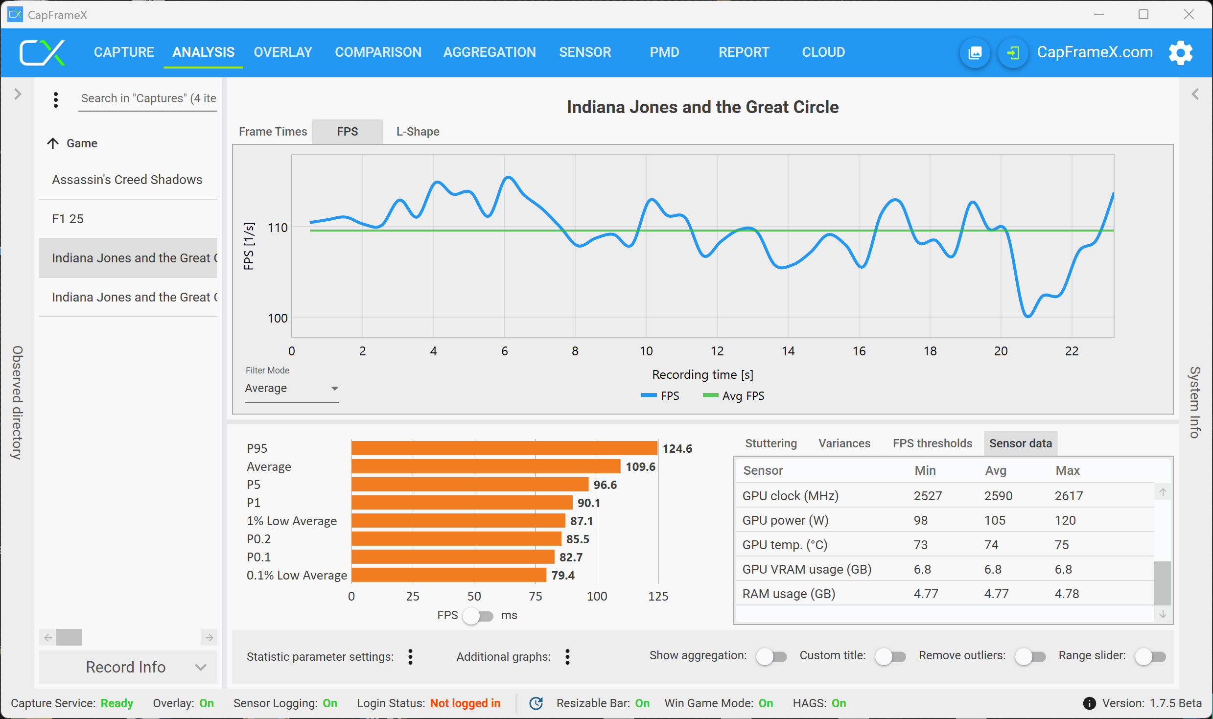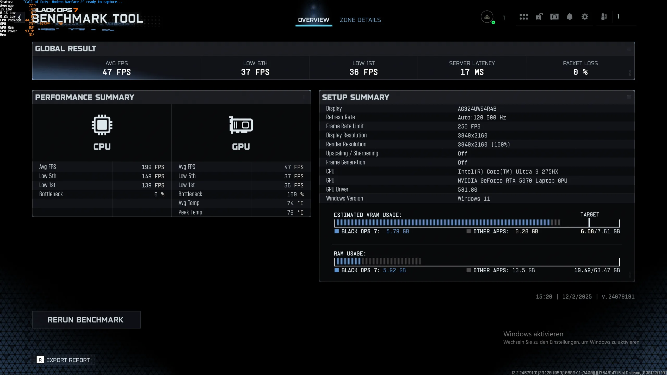 Vårt huvudfokus i den här artikeln är dock inte den rena prestandan, utan om den tillgängliga mängden VRAM resulterar i begränsningar när du spelar spel, som stammar eller bildrutor eller prestandaförluster när du spelar under längre perioder. Förutom integrerade riktmärken har vi främst registrerat och analyserat prestandasiffrorna med verktyget CapFrameX. Vi började våra tester med RTX 5070 Laptop (8 GB VRAM) och bytte sedan till RTX 5070 Ti Laptop med 12 GB VRAM när vi märkte problem.