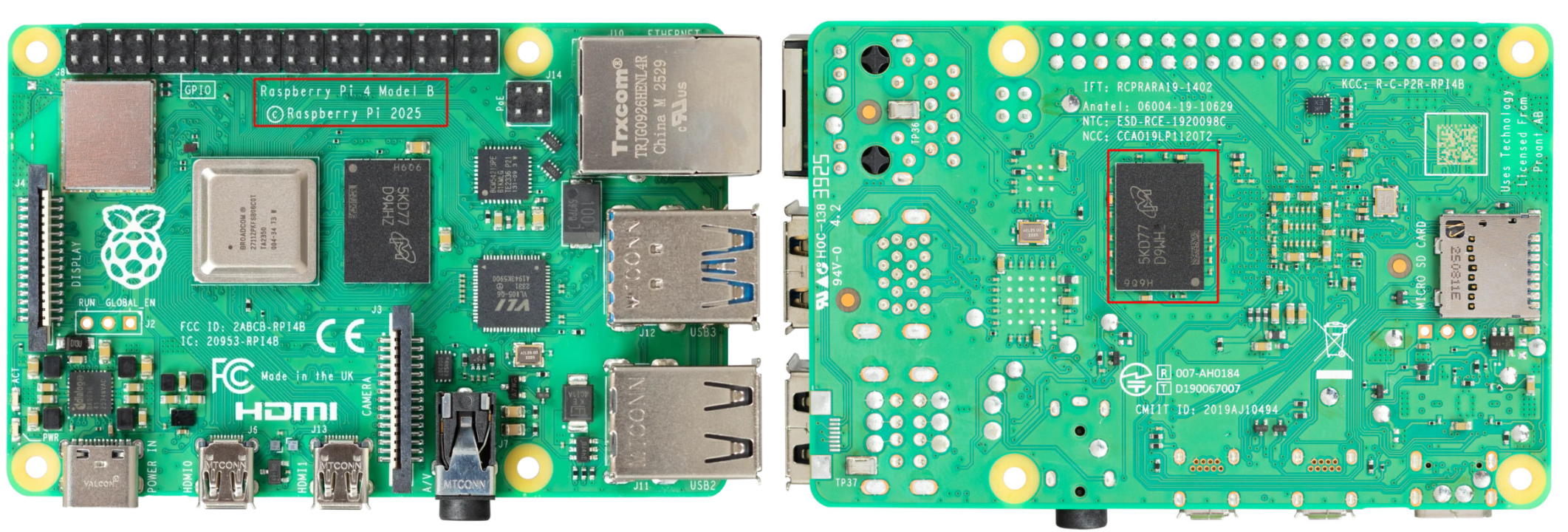 Tidigare i år, Raspberry Pi bekräftade att man skulle återlansera Raspberry Pi 4 Model B ( för närvarande 72,99 USD på Amazon) med en ny version. Det nya Raspberry Pi 4 Model B-kortet kallades "Rev 1.5" och skilde sig från befintliga varianter med ett andra RAM-chip på undersidan. En annan identifierare är "Raspberry Pi 2025"-skärmtrycket på SBC:ns ovansida.