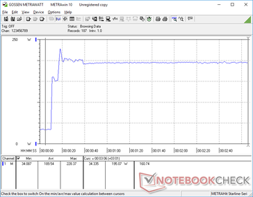 Tomgångskörning på skrivbordet drar mellan 20 W och 32 W beroende på ljusstyrka och MUX-inställning. Att hoppa från minimal till maximal ljusstyrka drar ca 5 W mer ström medan aktivering av dGPU-läget kräver ytterligare 7 W.