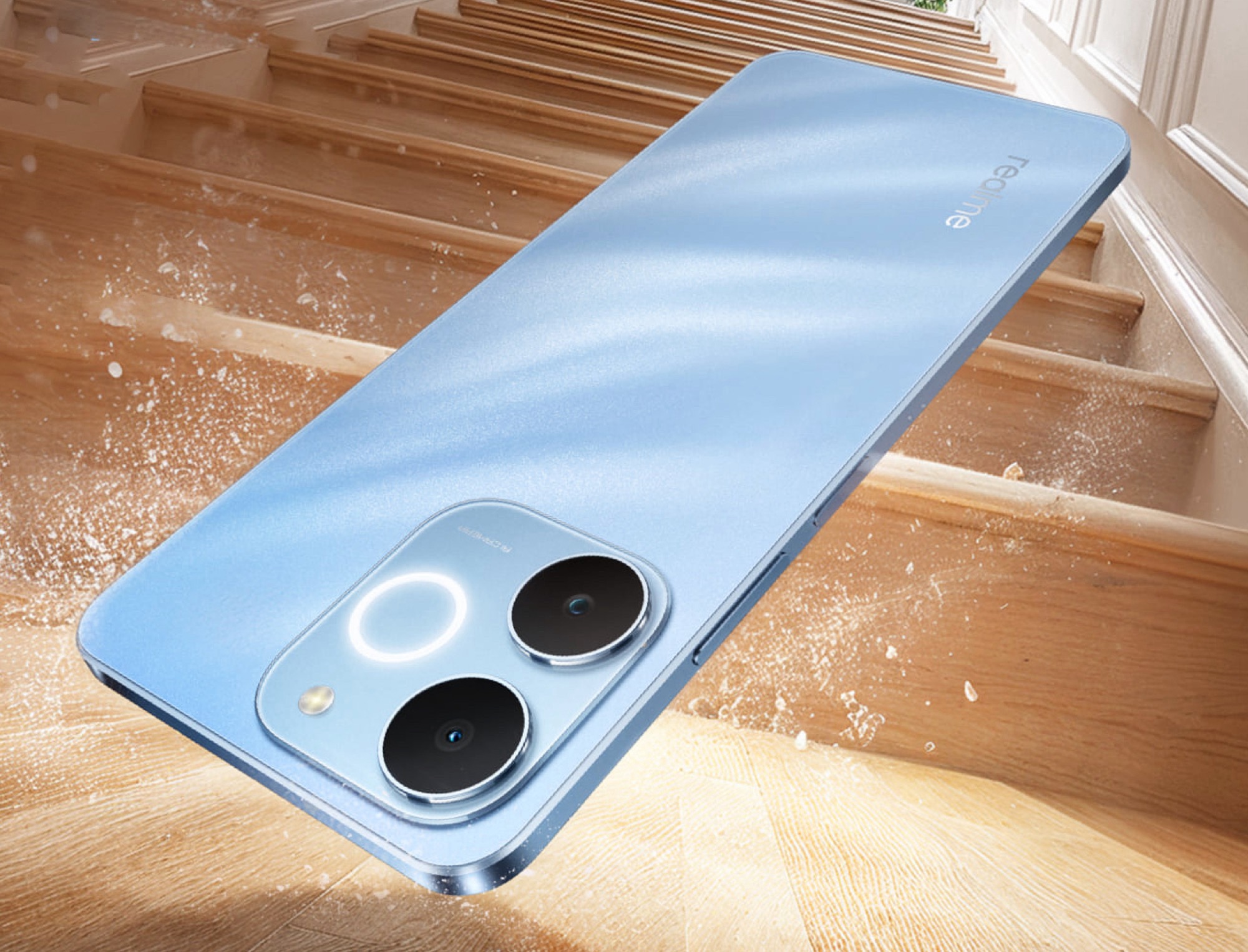 Det enda utmärkande draget i designen är "Pulse Light", en ringformad LED-lampa i kameramodulen som indikerar inkommande meddelanden. Det 7,94 millimeter tjocka och 201 gram tunga höljet är IP54-certifierat, vilket innebär att det endast är stänksäkert. Även om mellanklassmobilen är tunnare än en Apple iPhone 17, har Realme lyckats få plats med ett betydligt större batteri på 6.300 mAh