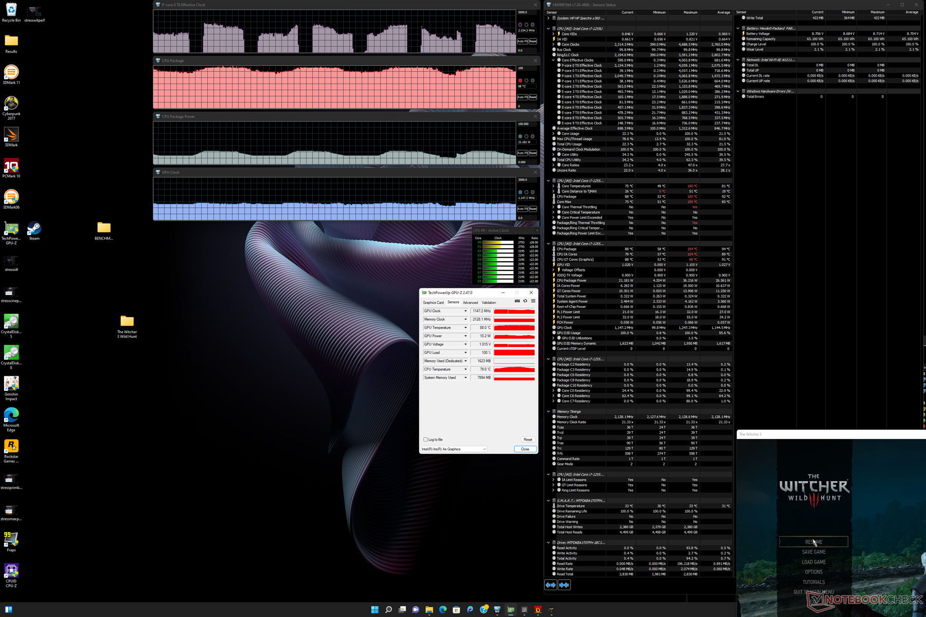 GPU:s klockfrekvens stabiliserades på cirka 1147 MHz medan temperaturen växlade mellan 72 C och 97 C när den kördes Witcher 3 i prestandaläget. Den stabila klockfrekvensen löser problemet med cyklande bildfrekvens som vi observerade på 2020-modellen för stabilare spelprestanda. GPU-klockfrekvensen skulle sjunka till 998 MHz om den körs i balanserat läge tillsammans med andra brister, vilket visas i skärmdumparna nedan.