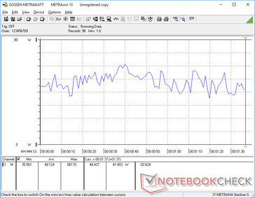 Vi kan registrera ett tillfälligt maximalt uttag på 65,2 W från den lilla (~9,6 x 5,3 x 2,2 cm) 65 W AC-adaptern, vilket framgår av skärmdumparna nedan när CPU:n är 100 procent utnyttjad.