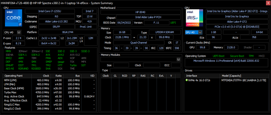| HP Spectre x360 13.5 14t-ef000 i7-1255U, Iris Xe G7 96EUs, Micron 3400 1TB MTFDKBA1T0TFH, OLED, 3000x2000, 13.5" | HP Spectre x360 14-ea0378ng i7-1165G7, Iris Xe G7 96EUs, Intel Optane Memory H10 with Solid State Storage 32GB + 1TB HBRPEKNX0203AH(L/H), OLED, 3000x2000, 13.5" | Framework Laptop 13.5 12th Gen Intel i7-1260P, Iris Xe G7 96EUs, WDC PC SN730 SDBPNTY-512G, IPS, 2256x1504, 13.5" | Lenovo ThinkPad X1 Titanium Yoga G1 20QB0016GE i5-1140G7, Iris Xe G7 80EUs, Lenovo UMIS RPJTJ256MEE1OWX, IPS LED, 2256x1504, 13.5" | Framework Laptop 13.5 i7-1165G7, Iris Xe G7 96EUs, Western Digital WD_BLACK SN850 WDS100T1X0E, IPS, 2256x1504, 13.5" | HP EliteBook Folio 13.5-3G2L2EA SD 8cx Gen 2 5G, Adreno 680, Toshiba XG6 KXG60ZNV512G, IPS, 1920x1280, 13.5" | Microsoft Surface Laptop 4 13 Ryzen 5 R5 4680U, Vega 7, Samsung PM991 MZ9LQ256HBJQ, IPS, 2256x1504, 13.5" | |