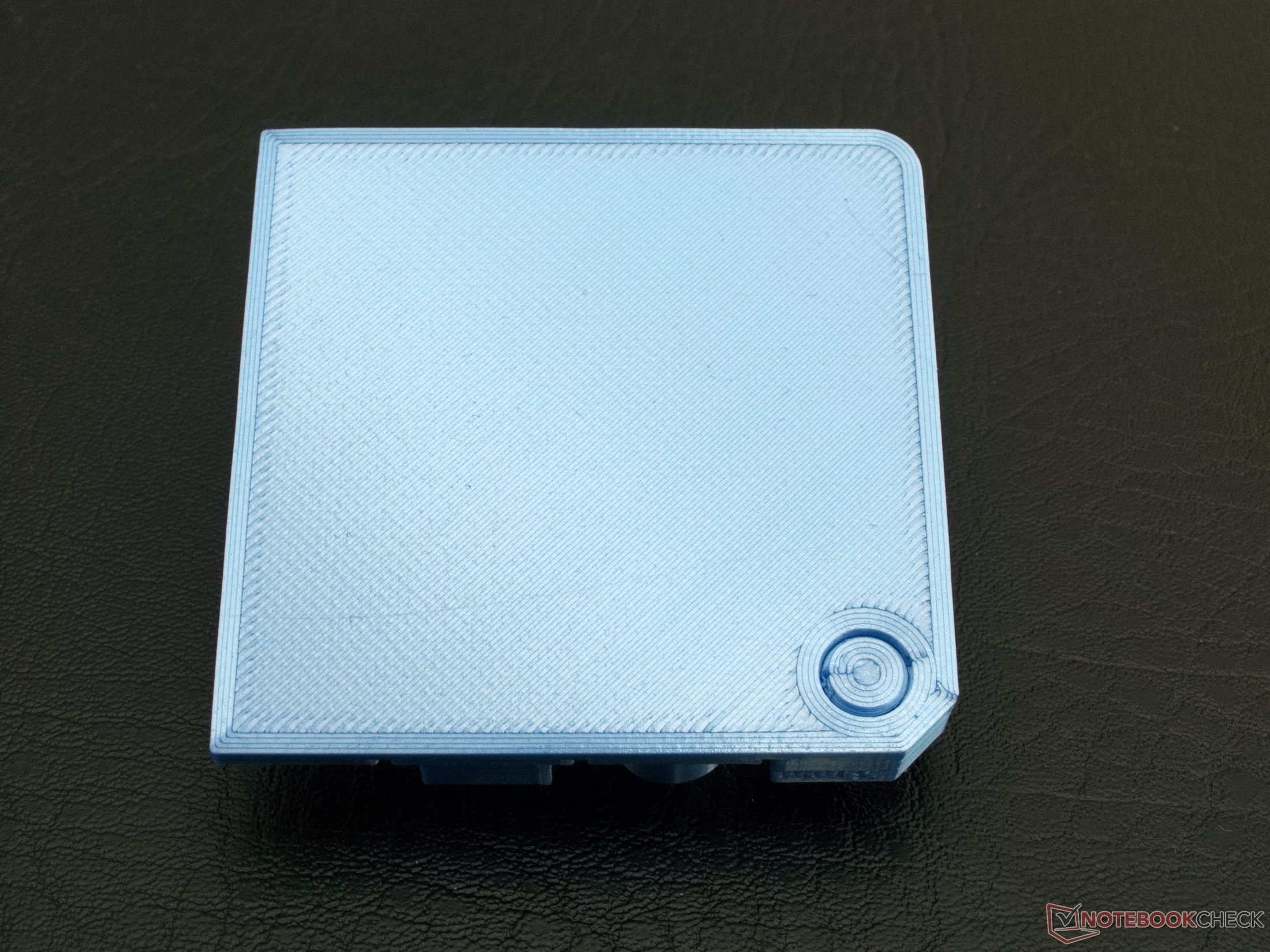 Vår testmodell (här på Thingiverse) kan inte bevisa några allvarliga problem med 3D-skrivaren. Endast några små brister visar att inställningarna för indragning i Cura-profilen kan förbättras. Dock kan knappt någon strängbildning och inga trådklumpar upptäckas. Sammanfattningsvis är alla områden dimensionellt korrekta, vidhäftningen på utskriftsbädden är optimal och även överhäng skapas utan problem. De två delarna med utskrift på plats kan flyttas efter utskrift. Utskriftskvaliteten med det använda silk-blue PLA-filamentet är mer än bra