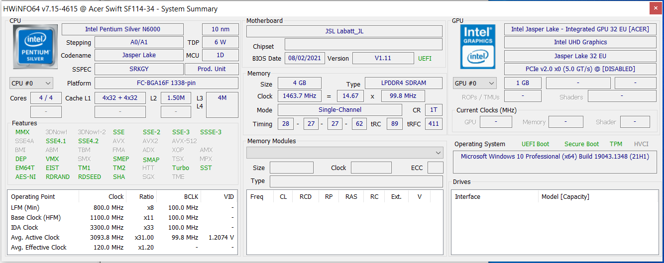 | 81.5 % v7 (old) | 12/2021 | Acer Swift 1 SF114-34-P6U1 Pentium N6000, UHD Graphics (Jasper Lake 32 EU) | 1.3 kg | 14.95 mm | 14.00" | 1920x1080 | |