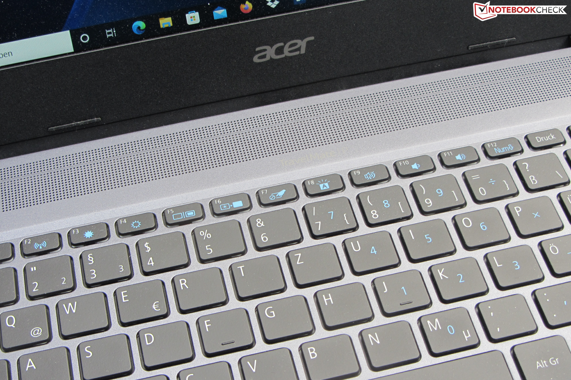 De mjuka tangenterna på det bakgrundsbelysta chiclet-tangentbordet har kort slaglängd och en tydlig tryckpunkt. Tangentbordet ger minimalt efter i mitten när du skriver. Det visade sig dock inte vara störande. Belysningen med en enda nivå styrs med en funktionstangent. Acer levererar här ett tangentbord som lämpar sig för daglig användning.