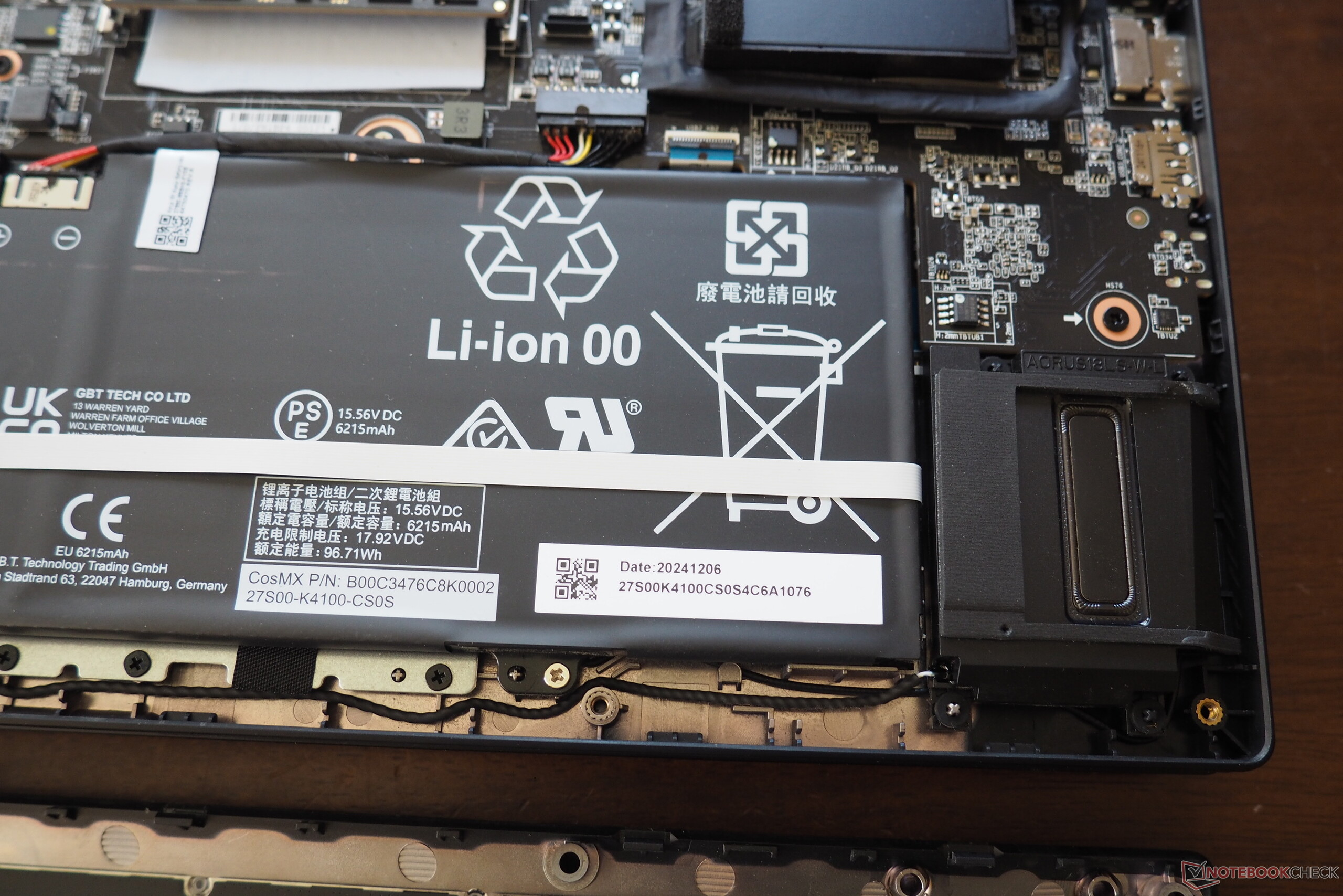 När det gäller anslutningar är Gigabytes bärbara dator en riktig höjdare. Två Thunderbolt-portar (en v4 och en v5) med DisplayPort- och Power Delivery-funktionalitet lämnar inget övrigt att önska. Det finns också tre klassiska USB-A-portar som fungerar enligt 3.2 Gen2-standarden. Paketet avrundas med ett ljuduttag, en HDMI 2.1-utgång och en fullfjädrad SD-kortläsare. En 2,5 GBit LAN-port hanterar trådbundna nätverk.