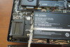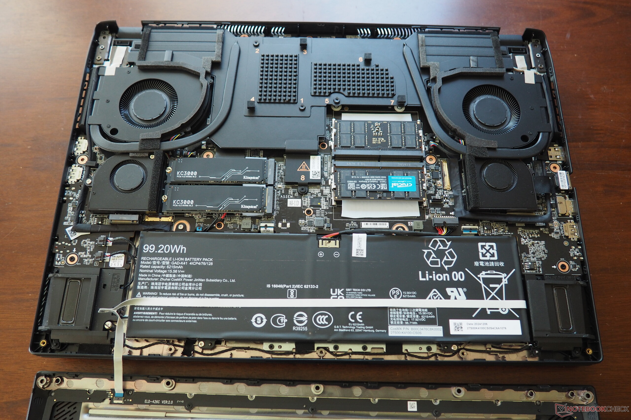 Du kan lossa basplattan efter att ha tagit bort 13 Torx-skruvar (varning: basplattan har kablar för belysningen på framsidan). Uppgraderingsalternativ möjliggörs av en tom M.2-plats och två fria RAM-banker. En positiv sak: Den bärbara datorns kylsystem använder ångkammarteknik.