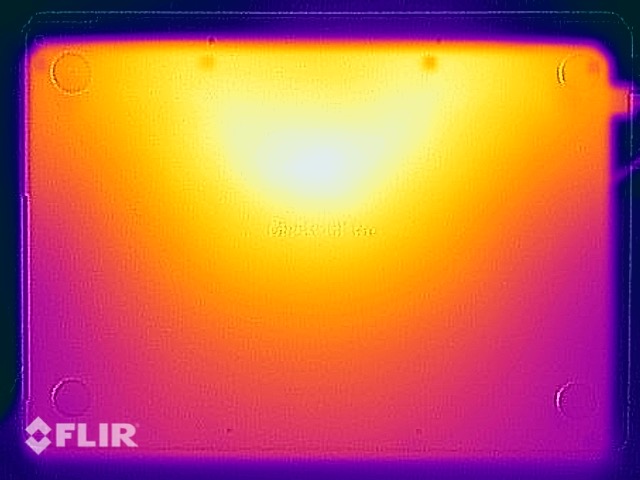 Yttemperaturerna och fördelningen är mycket lika grundmodellen förMacBook Pro 14. Den bärbara datorn är vanligtvis mycket sval i vardagliga scenarier och du kan till och med lägga den i knät under belastning utan några begränsningar, eftersom undersidan bara värms upp till 44 °C. Det övre mittområdet på tangentbordet värms däremot upp till nästan 50 °C, vilket kan vara obekvämt när du skriver. Strömadaptern toppar på ~46 °C, vilket inte är kritiskt.