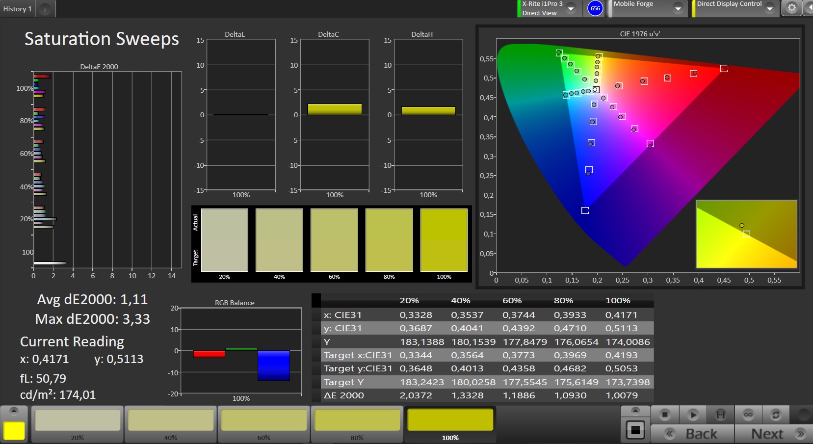Vad den saknar i upplösning kompenserar skärmen för i ljusstyrka och når i genomsnitt nästan 650 cd/m². Upplösningen av ljusstyrkan är ganska jämn. Svarta områden har en genomsnittlig ljusstyrka, vilket gör det möjligt att uppnå ett bra kontrastförhållande på 1655:1.