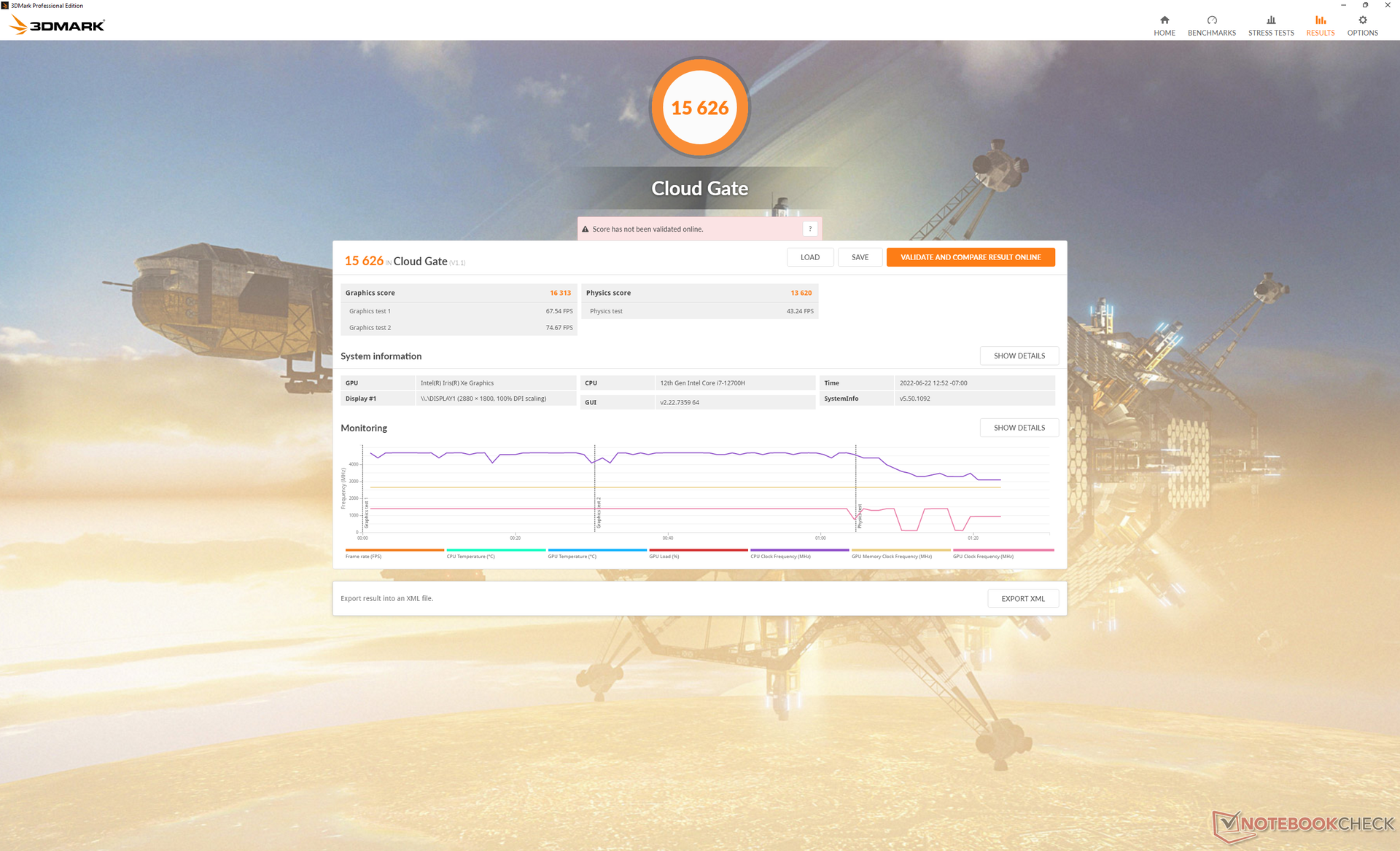 Att köra på batteri begränsar prestandan. Ett Fire Strike -test på batterier skulle ge resultat för fysik och grafik på 11940 respektive 2698 poäng, jämfört med 21078 och 3263 poäng när det är på nätet.