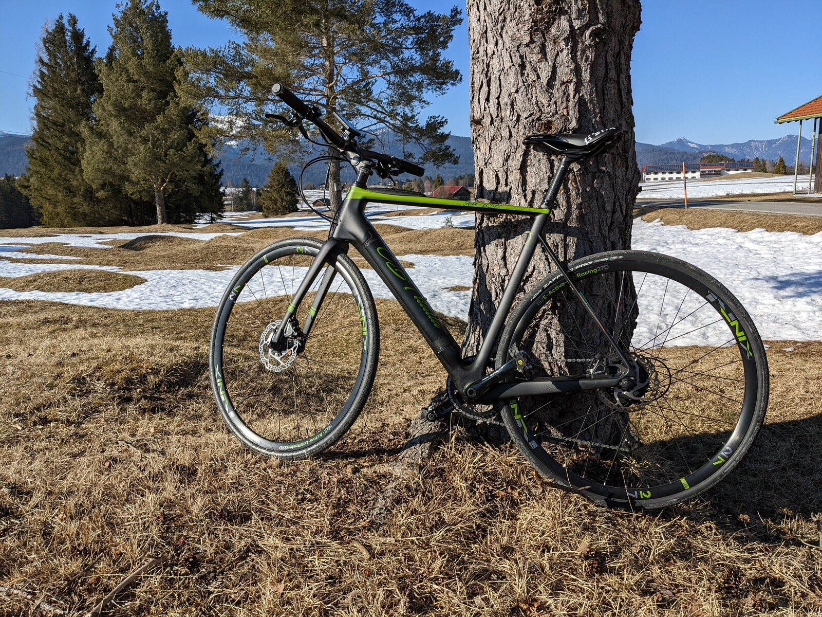 Fitness- och stadscykelns höjdpunkt är ramen. Om man bortser från styret, som garanterar en bekväm sittställning och kan justeras i höjdled via styret, har man en smal racercykel framför sig. Några klistermärken som ändrar färg beroende på ljuset sätter tonen. Själva ramen är svartlackerad, men användningen av klarlack på ett antal ställen framhäver kolstrukturen. Vågarna klargör att detta inte bara är för att visa upp sig. Med Shimano PDS klicklösa pedaler (ingår inte) noterade vi en totalvikt på 14,3 kilo, inklusive motor, batteri och allt tillbehör.